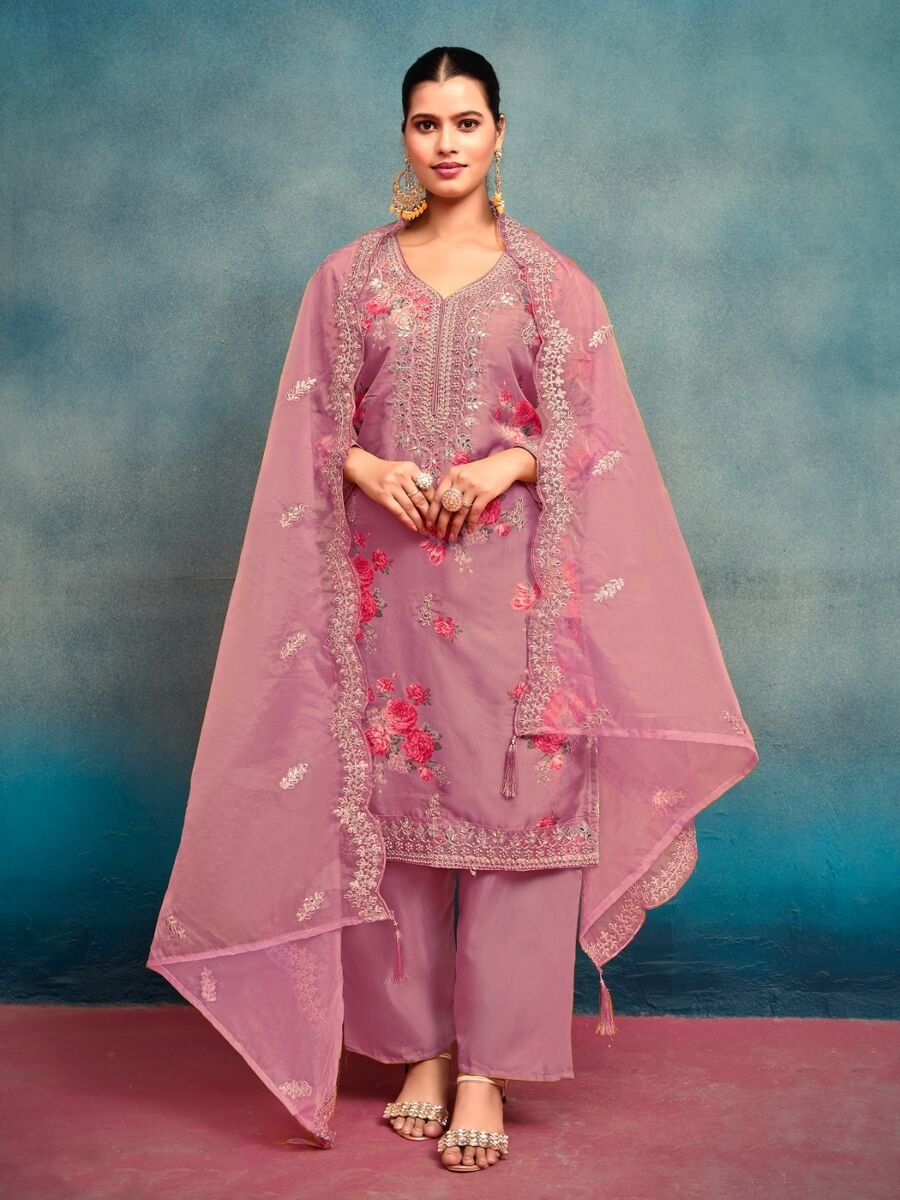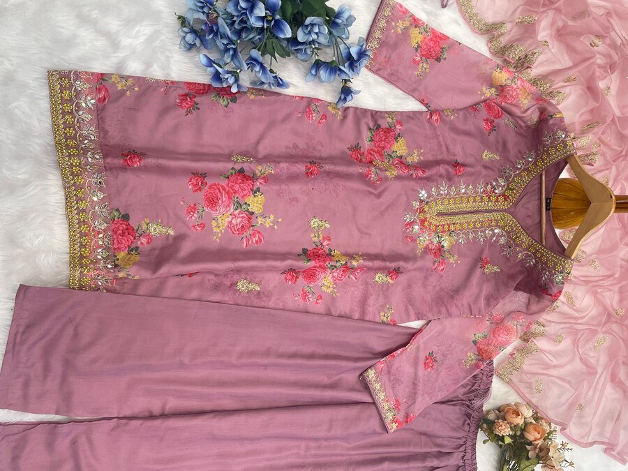 NEW ARRIVAL TABBY SILK DIGITAL PRINT AND EMBROIDERY SEQUENCE WORK WITH MOTI WORK TOP BOTTOM WITH DUPATTA BABY PINK