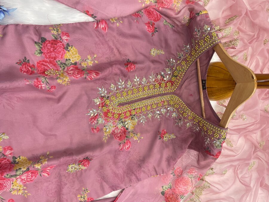 WORK :- DIGITAL PRINT AND EMBROIDERY SEQUENCE WORK WITH MOTI WORK
