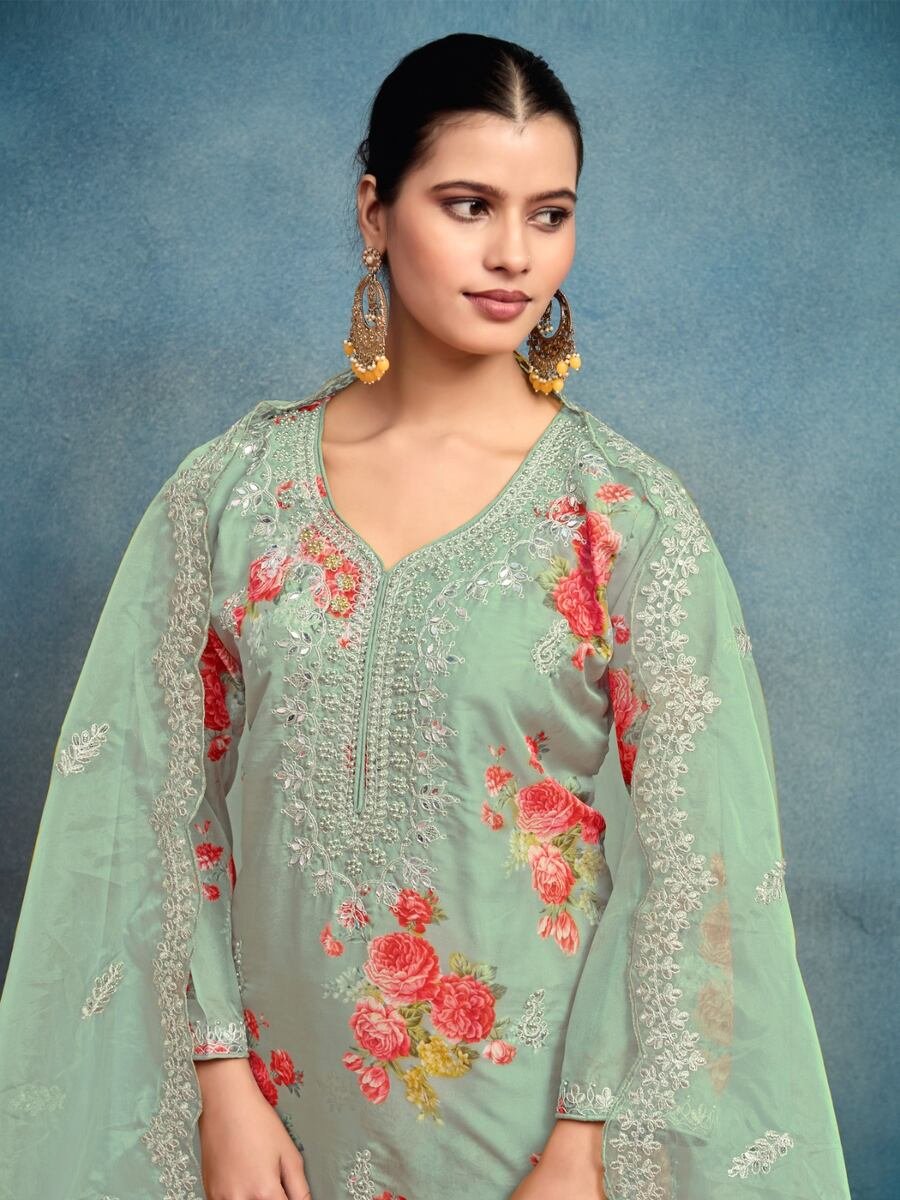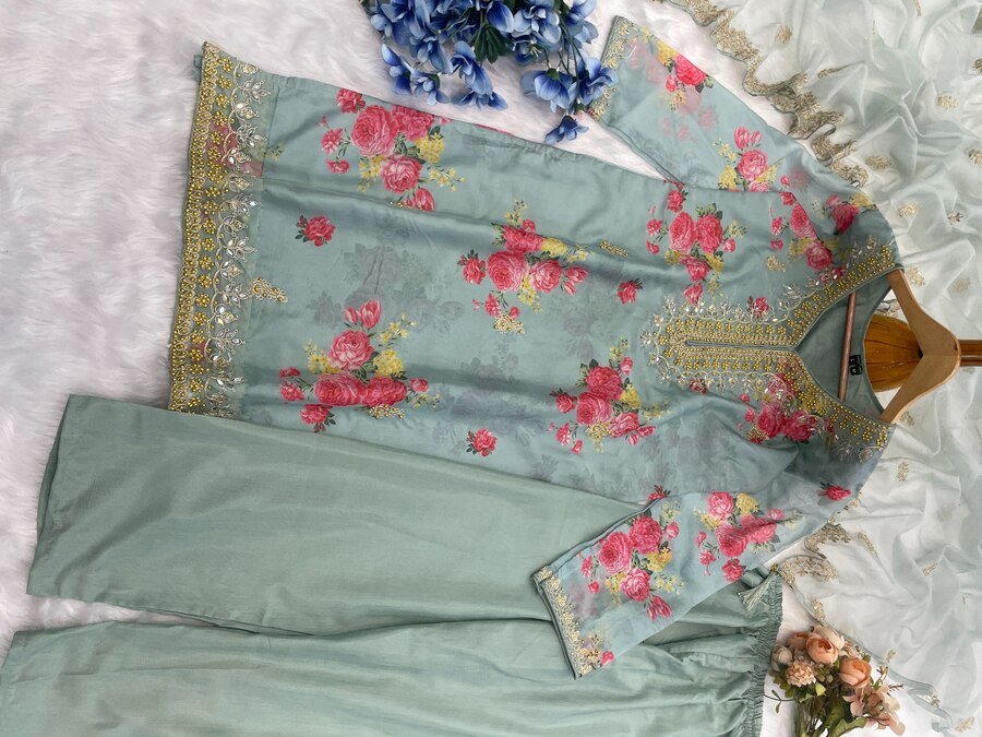 WORK :- DIGITAL PRINT AND EMBROIDERY SEQUENCE WORK WITH MOTI WORK