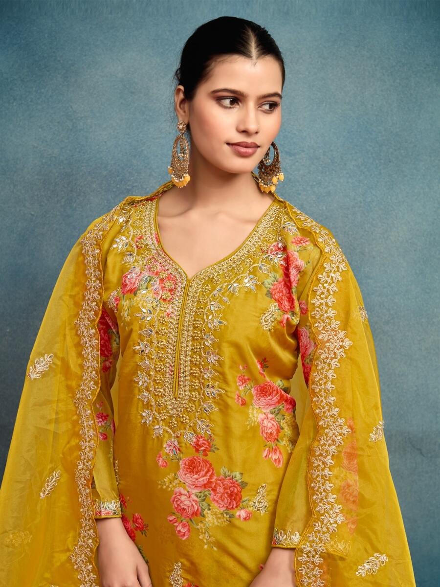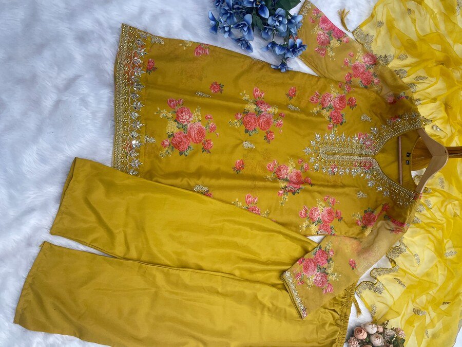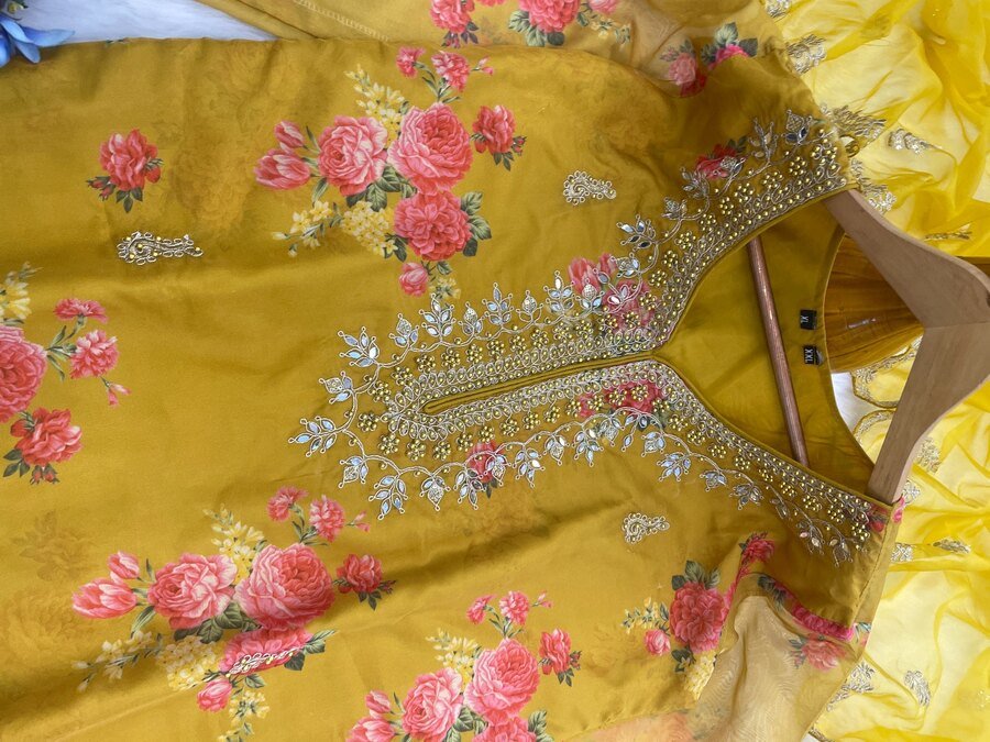 NEW ARRIVAL TABBY SILK DIGITAL PRINT AND EMBROIDERY SEQUENCE WORK WITH MOTI WORK TOP BOTTOM WITH DUPATTA YELLOW