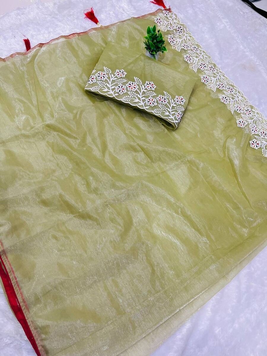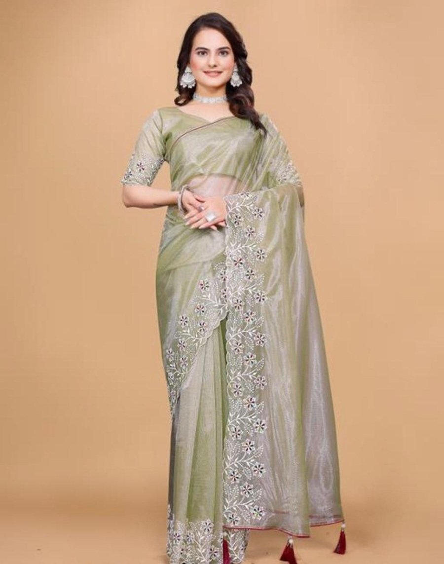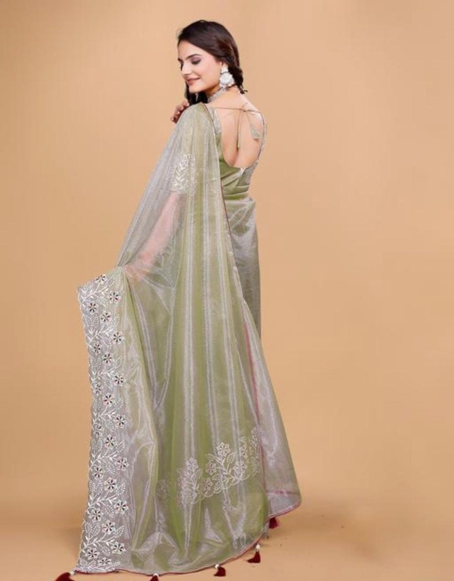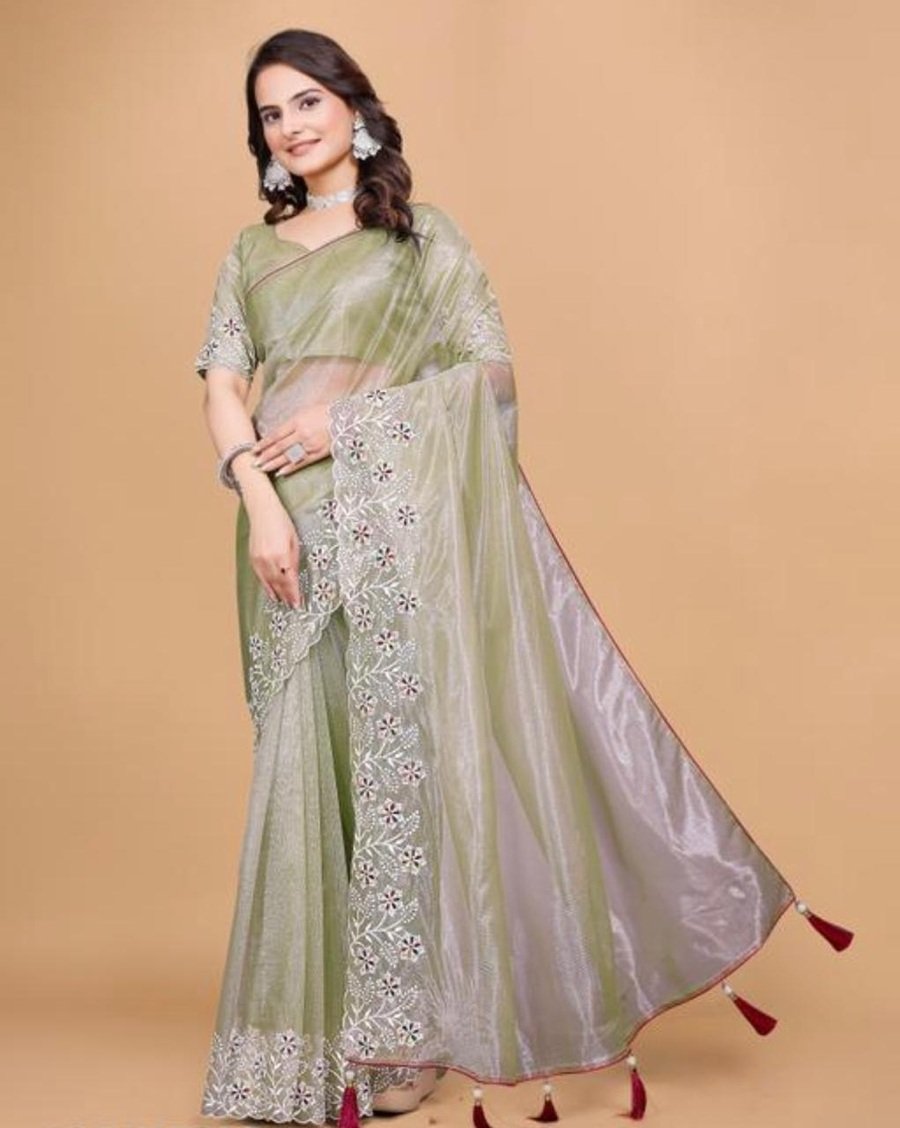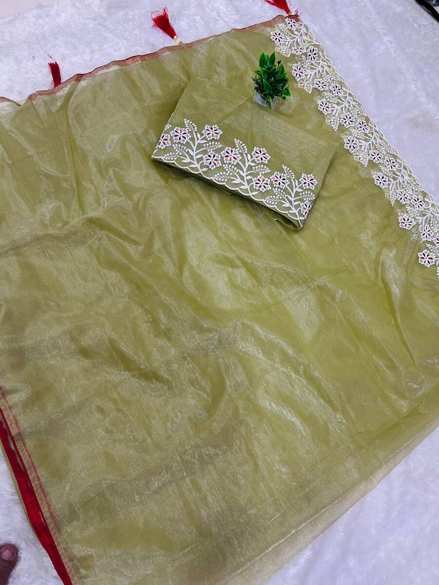 NEW ARRIVAL TWILL NET MULTI WORK PIPING LATKAN SAREE WITH UNSTITCHED BLOUSE GREEN
