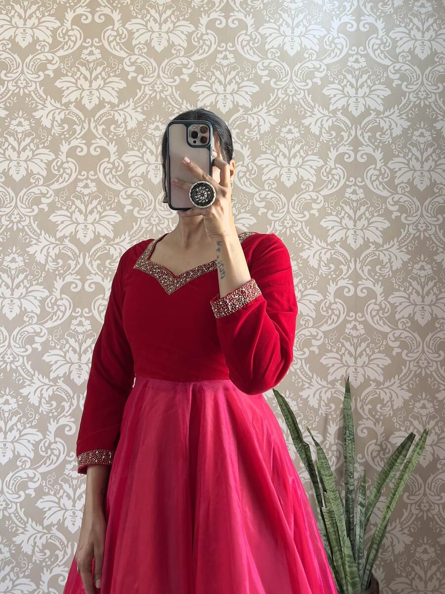 GOWN FABRIC :- PREMIUM 9000 VELVET & SOFT TWILL TISSUE SILK WITH KARDANI HAND WORK