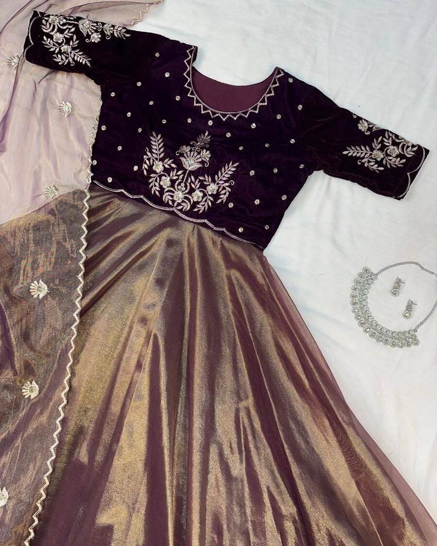 NEW ARRIVAL VELVET WITH TISSUE NET EMBROIDERY WORK GOWN WITH DUPATTA PURPLE