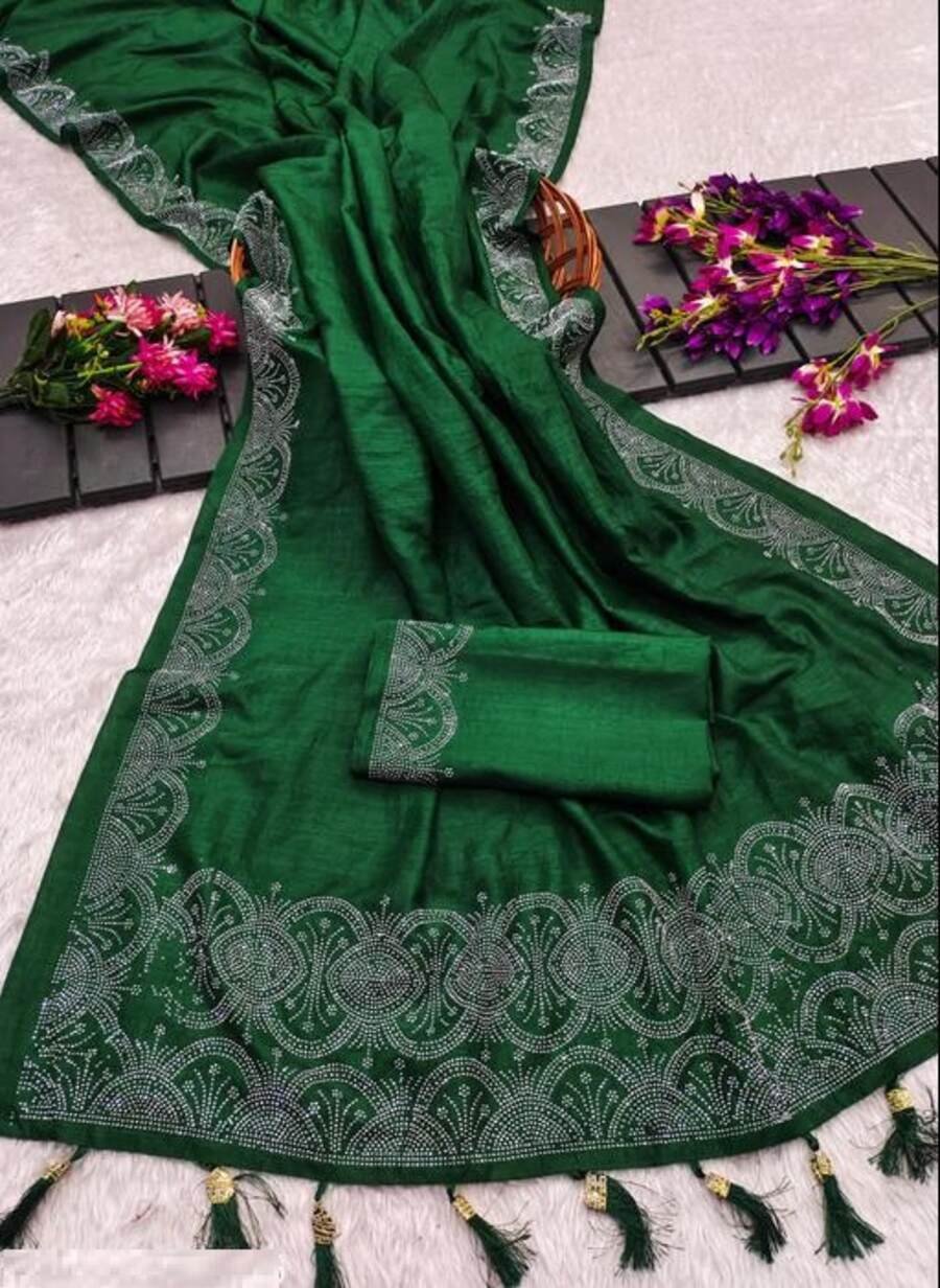 NEW ARRIVAL VICHITRA SILK HOT FIX WORK SAREE WITH UNSTITCHED BLOUSE GREEN