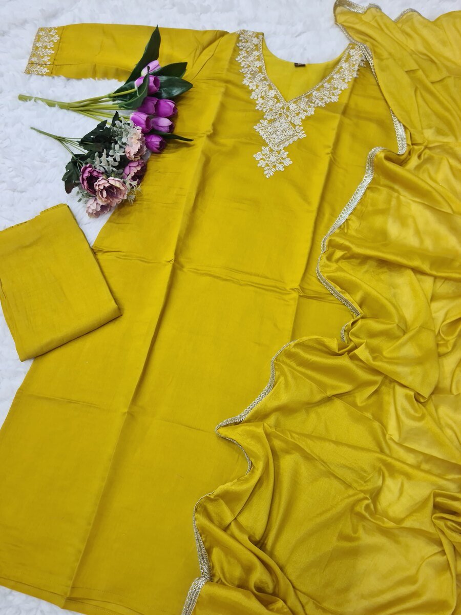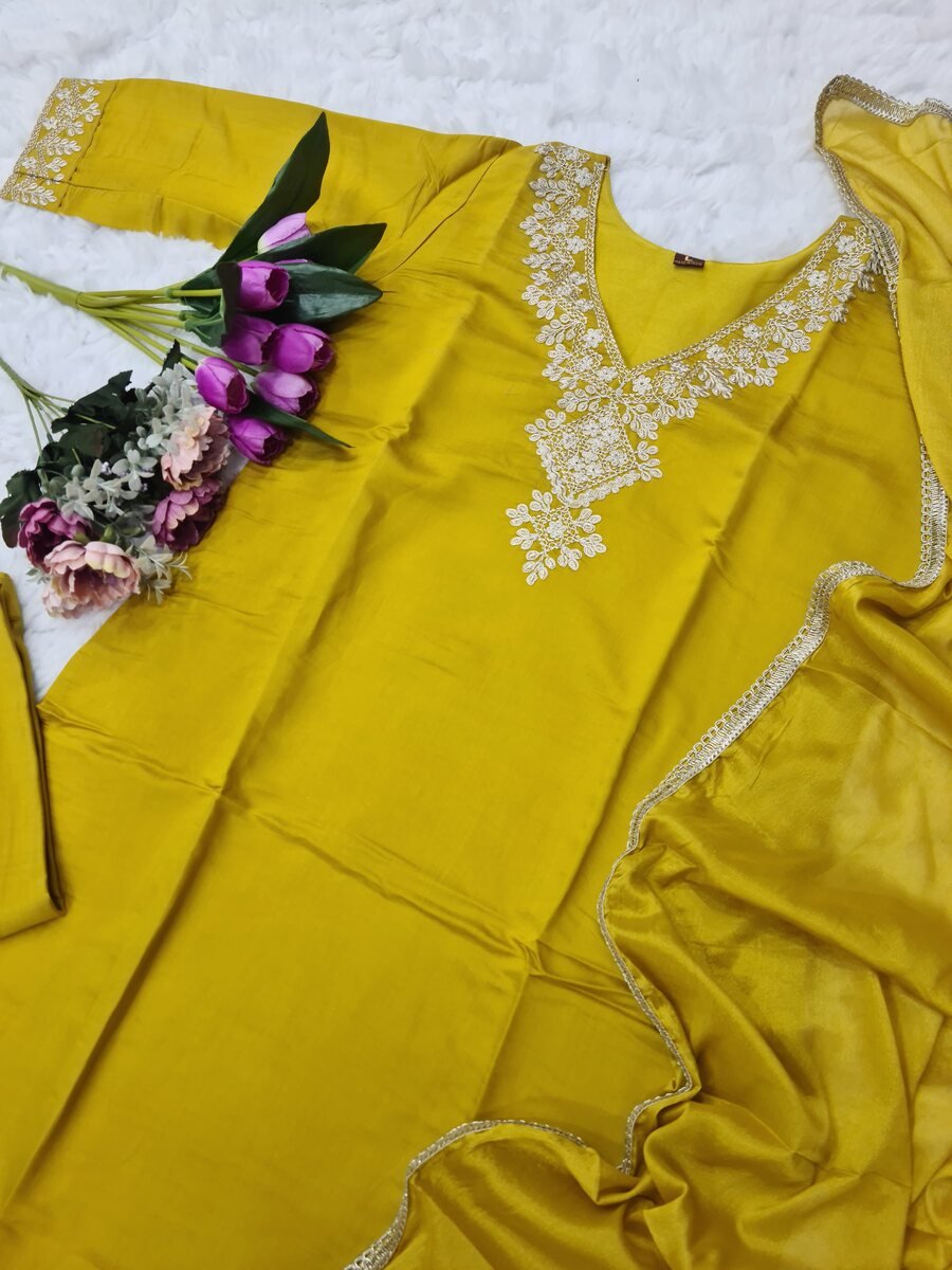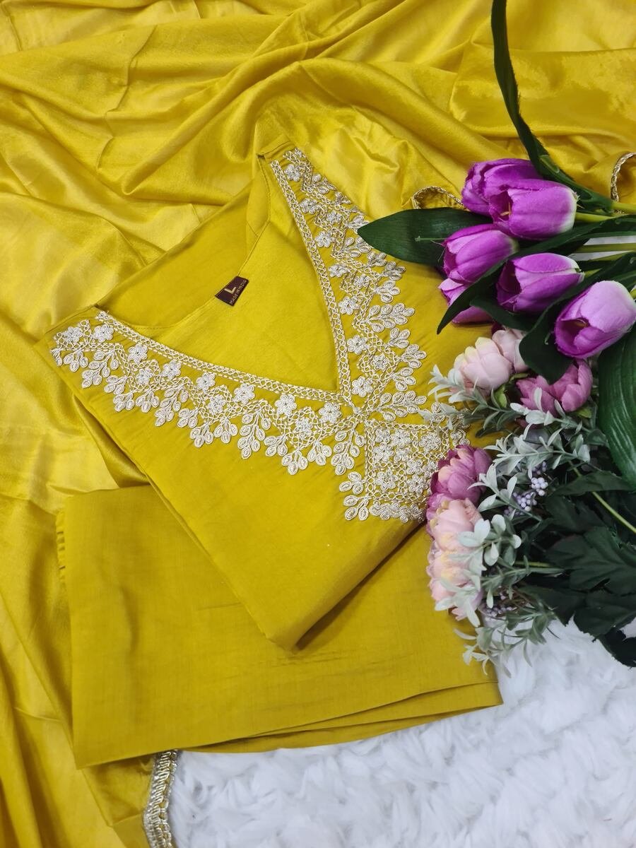 NEW ARRIVAL VISCOSE CHANDERI SEQUENCE EMBROIDERY WORK TOP BOTTOM WITH DUPATTA YELLOW