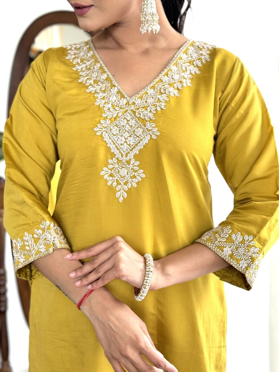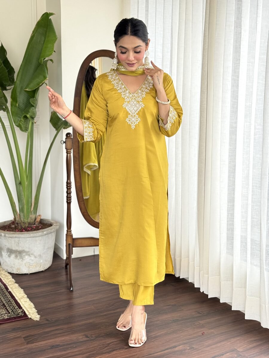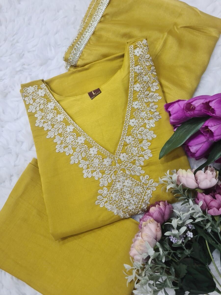 NEW ARRIVAL VISCOSE CHANDERI SEQUENCE EMBROIDERY WORK TOP BOTTOM WITH DUPATTA YELLOW
