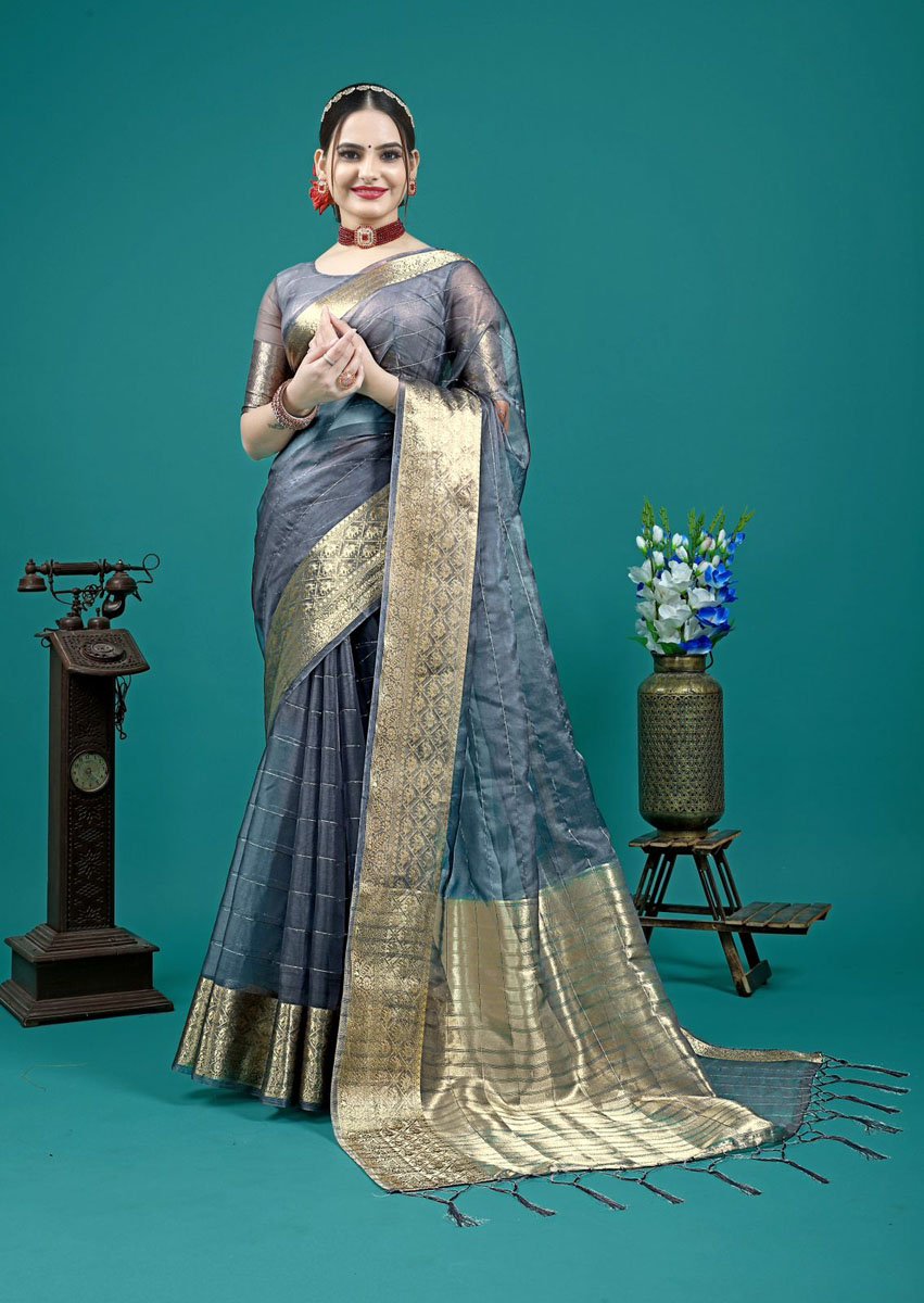 ORGANZA SILK SAREE ON SEQUENCE LINE WITH JACQUARD BORDER AND BLOUSE GREY