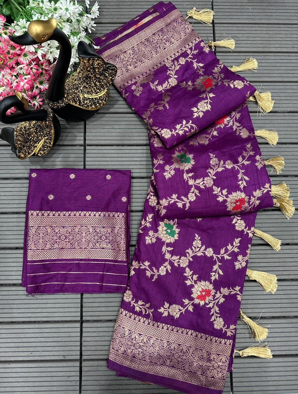 SAREE :- PURE DHOLA SILK WEAVING SAREE WITH RICH ZARI WOOVEN PALLU WITH FANCY TASSELS AND RICH ZARI WOOVEN BORDER WITH MEENAKARI JAIL WEAVING IN FULL SAREE PAIRS WITH CONTRAST PIPING LACE IN FULL SAREE WITH BUTTI CONTRAST BLOUSE