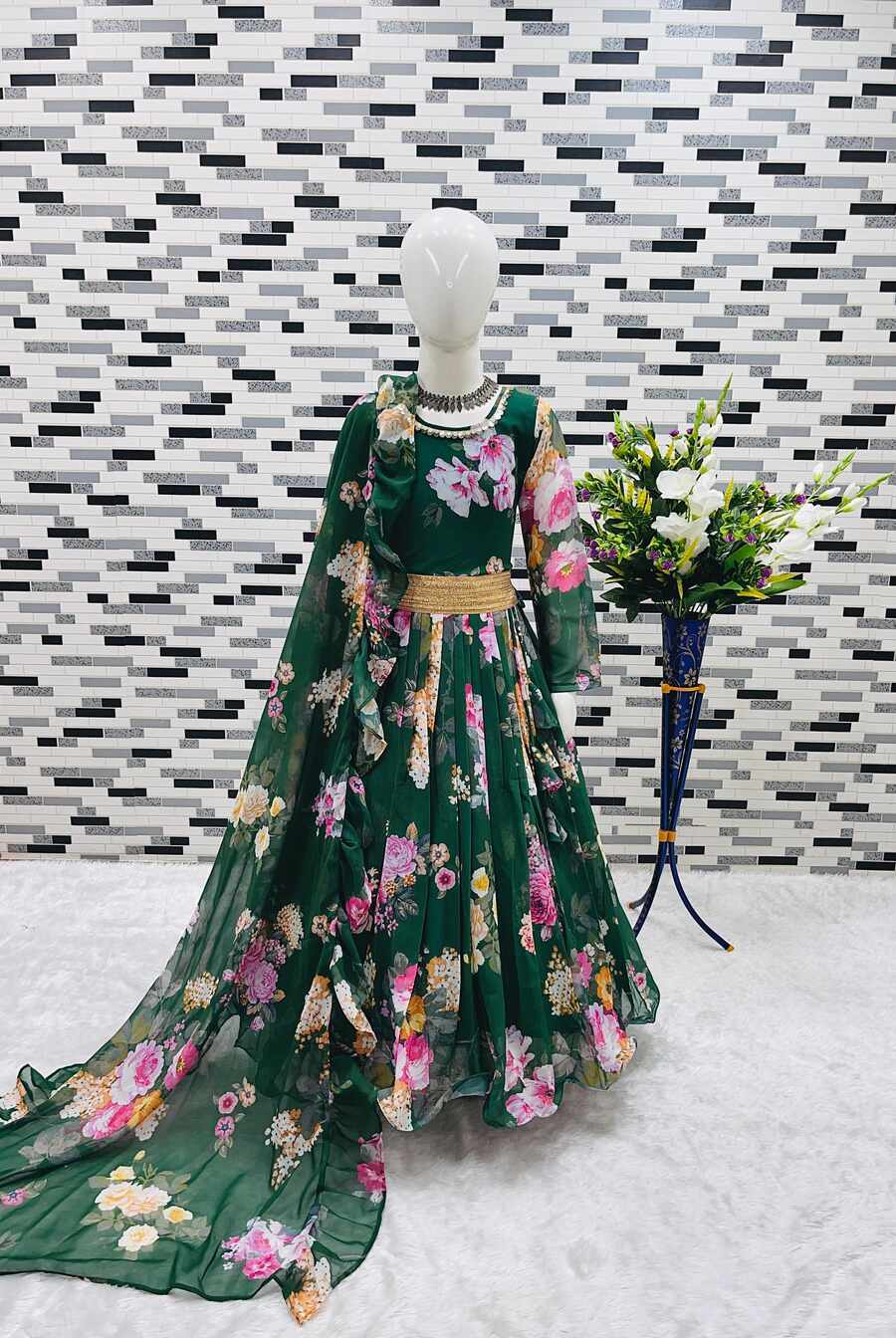 FABRICE :-HEAVY FAUX GEORGETTE WITH DIGITAL PRINT WITH SLEEVE AND LACE BELT WITH URF CUTTING NO JOINT IN FLAIR