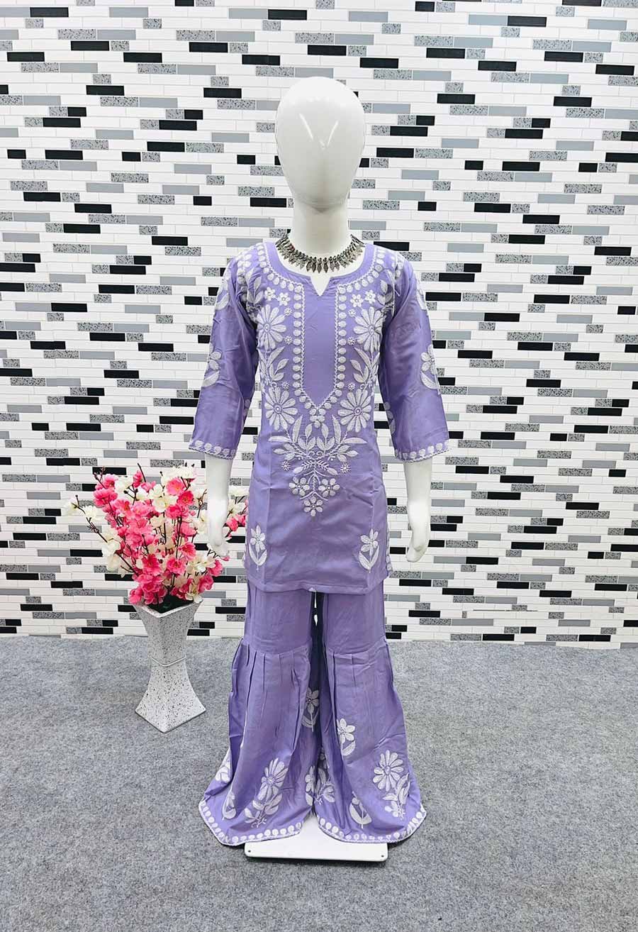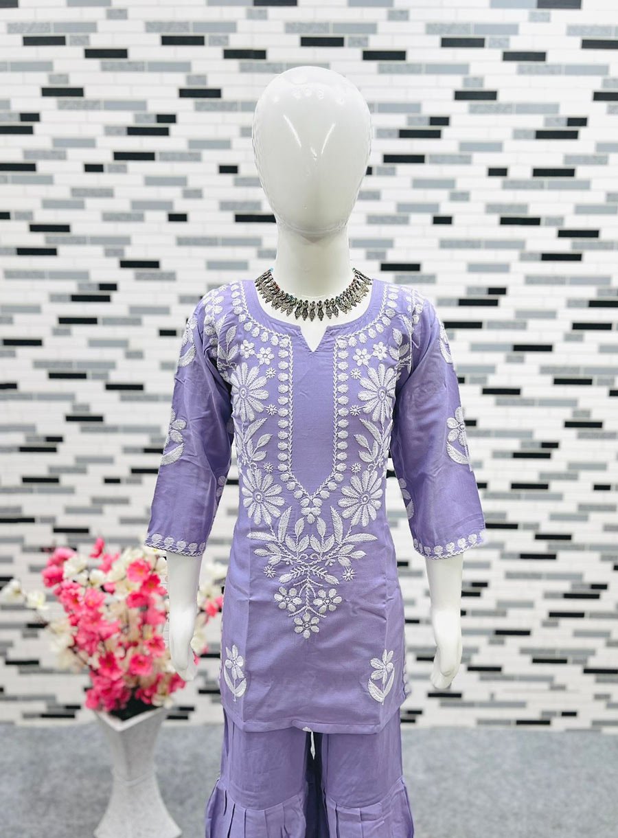PARTY WEAR RAYON COTTON EMBROIDERY WORK KID’S TOP WITH PALAZZO LAVENDER
