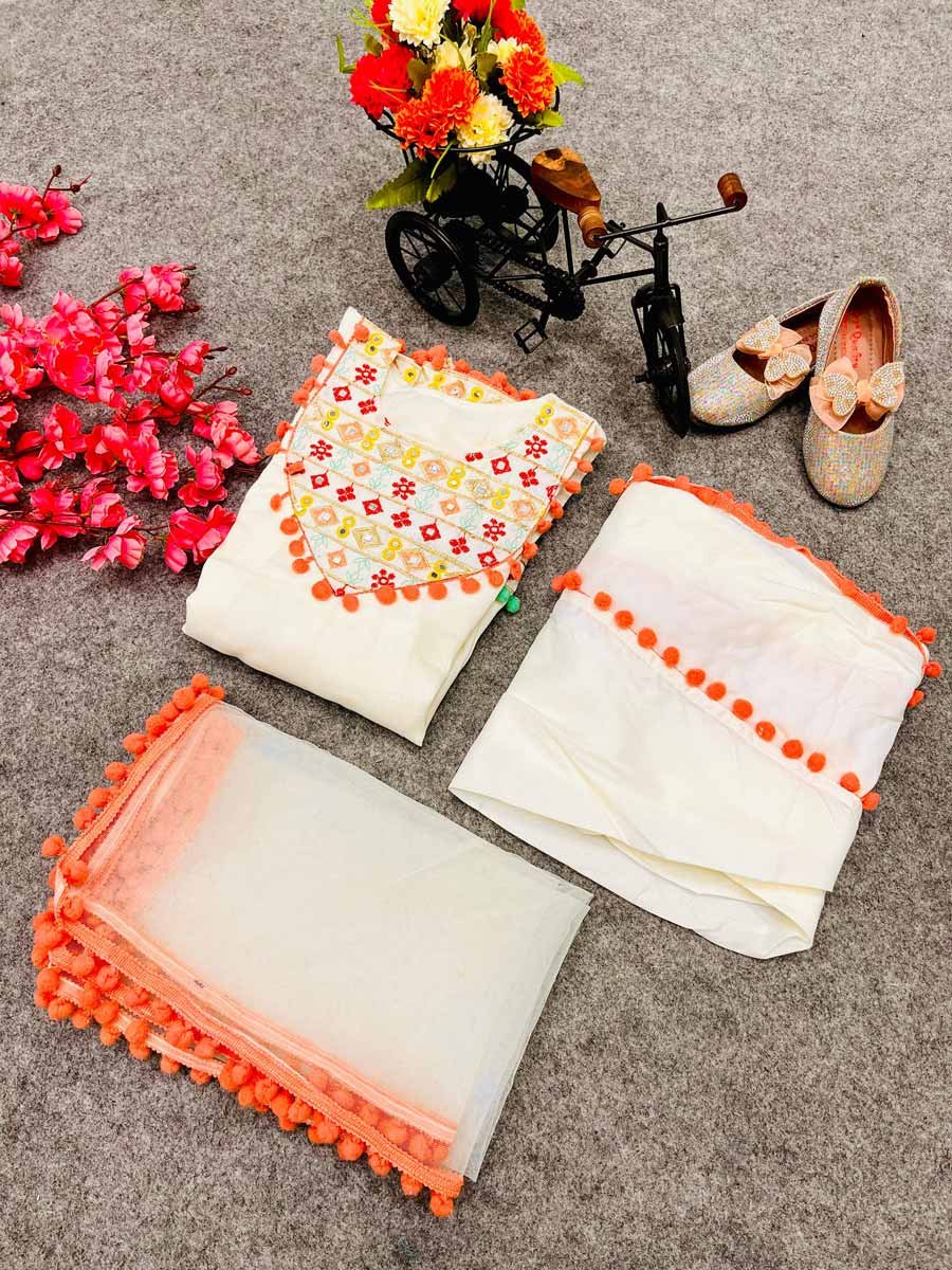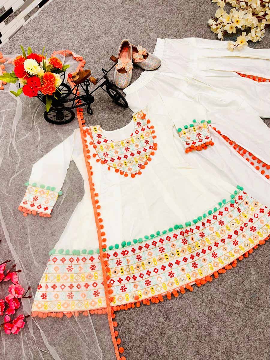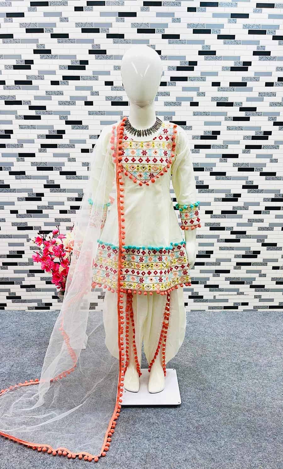 PARTY WEAR SATIN EMBROIDERY WITH MIRROR WORK TOP DHOTI WITH DUPATTA WHITE