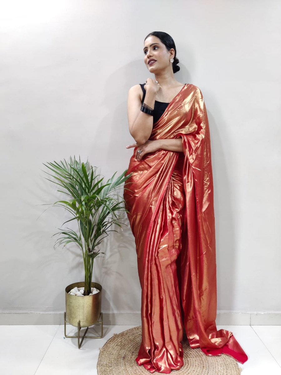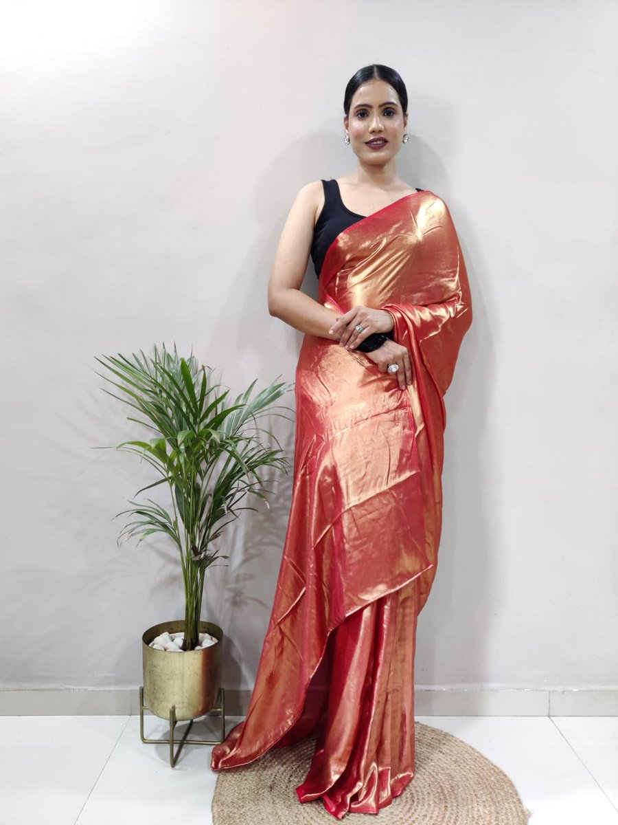 PARTY WEAR SATIN SILK PLAIN READY TO WEAR SAREE WITH UNSTITCHED BLOUSE RED