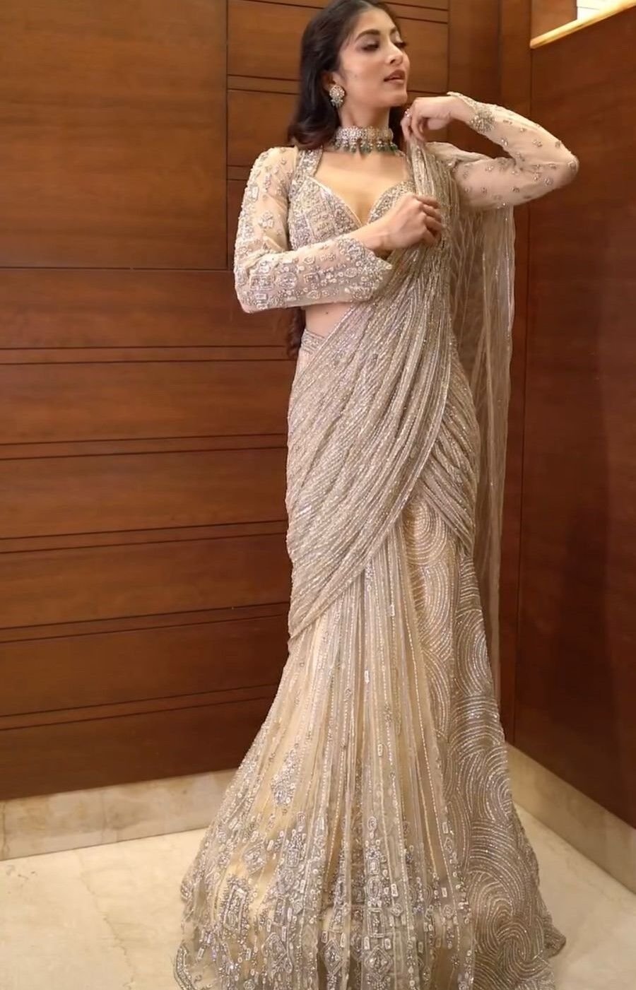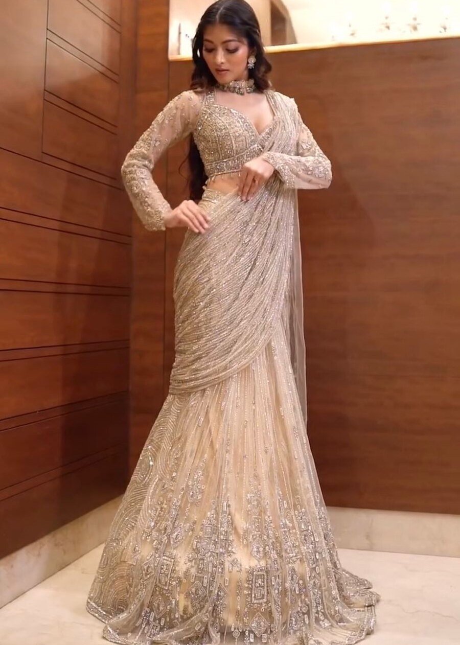 RICH LOOK BUTTERFLY NET SEQUENCE EMBROIDERY WORK LEHENGA SAREE WITH STITCHED BLOUSE OFF WHITE