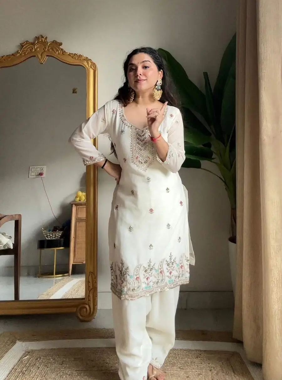 RICH LOOK CHINON BEADS AND SEQUENCE EMBROIDERY WORK TOP PATIYALA WITH DUPATTA WHITE