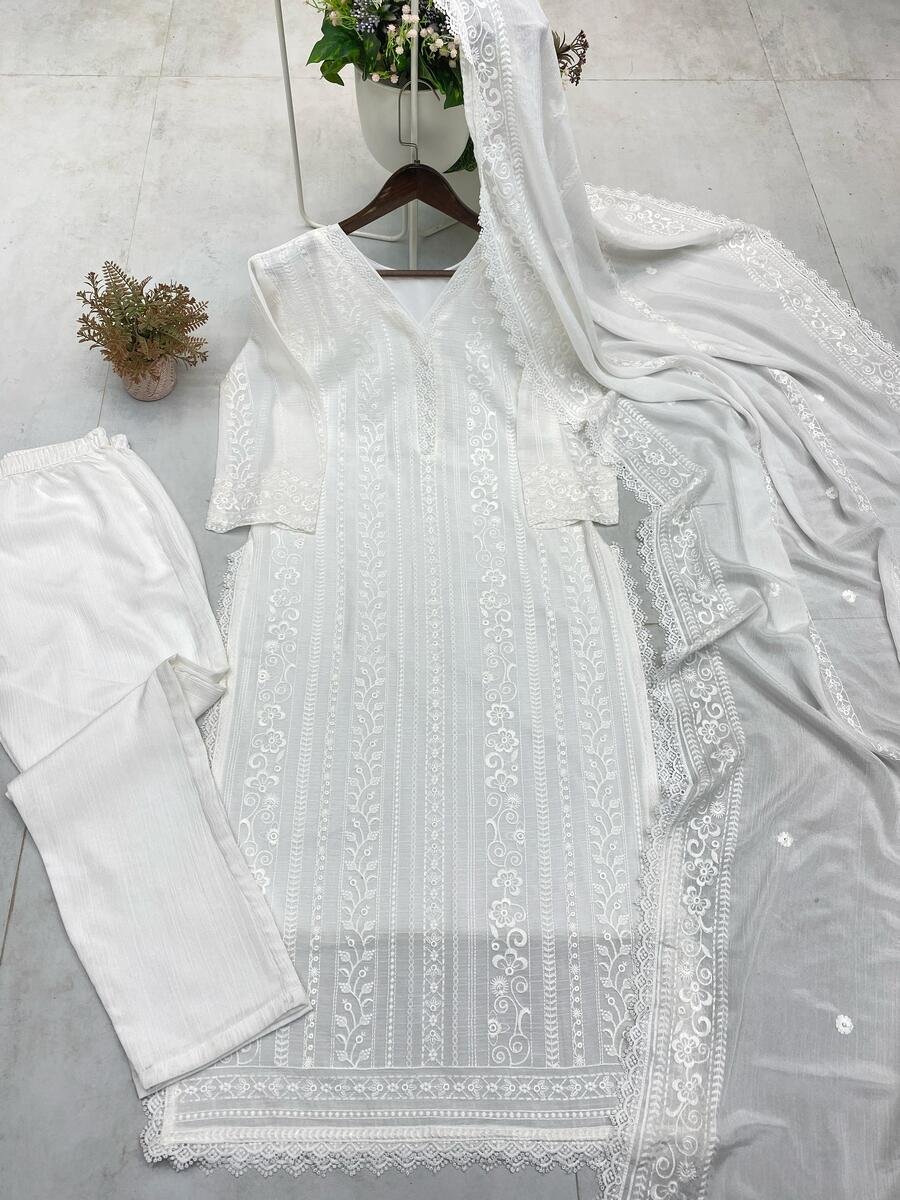 RICH LOOK CHINON COTTON THREAD EMBROIDERY WORK WITH GPO LACE WORK TOP BOTTOM WITH DUPATTA WHITE