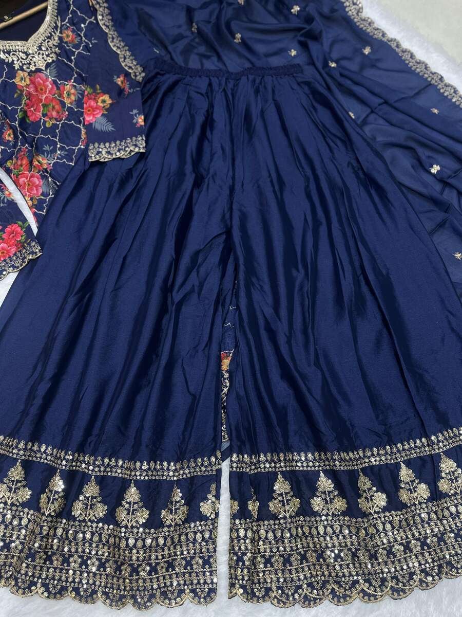 RICH LOOK CHINON SILK DIGITAL PRINT WITH EMBROIDERY SEQUENCE WORK TOP PALAZZO WITH DUPATTA NAVY BLUE