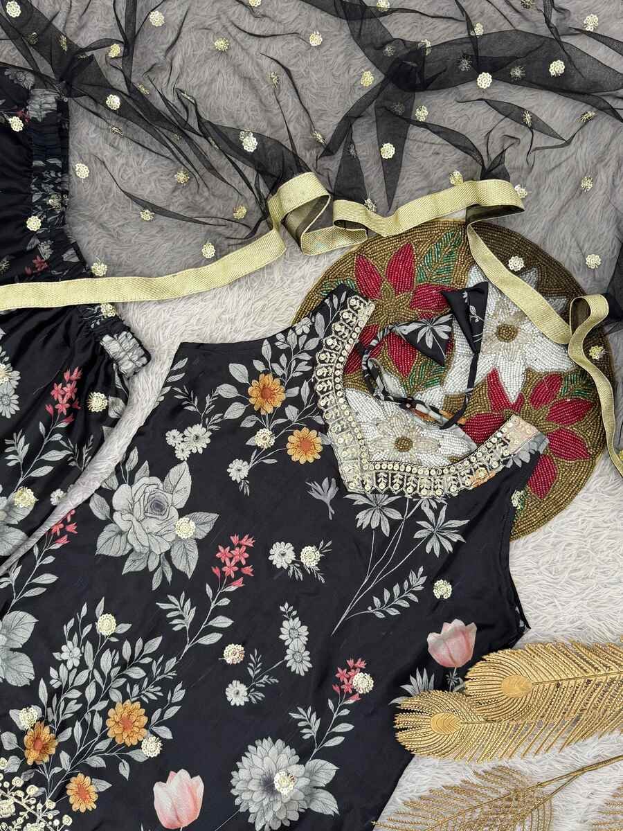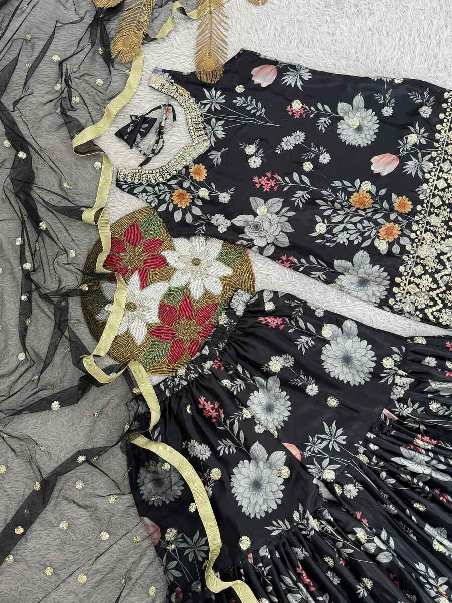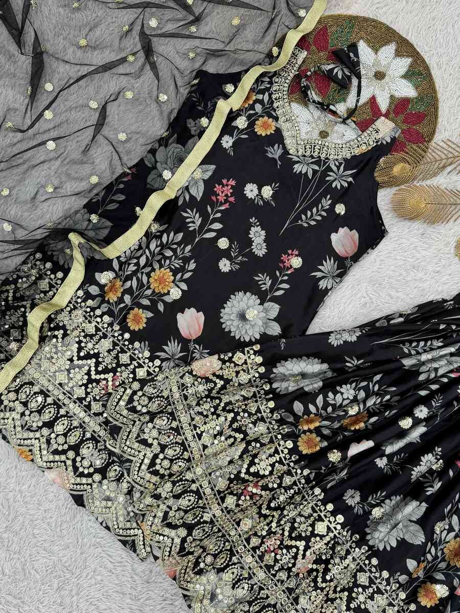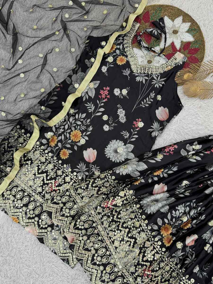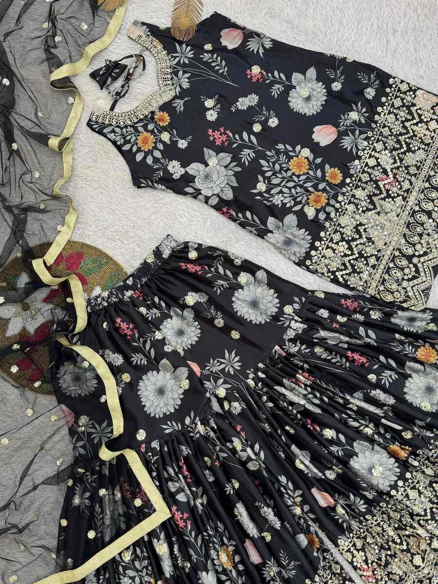 RICH LOOK CHINON SILK EMBROIDERY SEQUENCE WORK AND DIGITAL PRINT WORK TOP SHARARA WITH DUPATTA BLACK