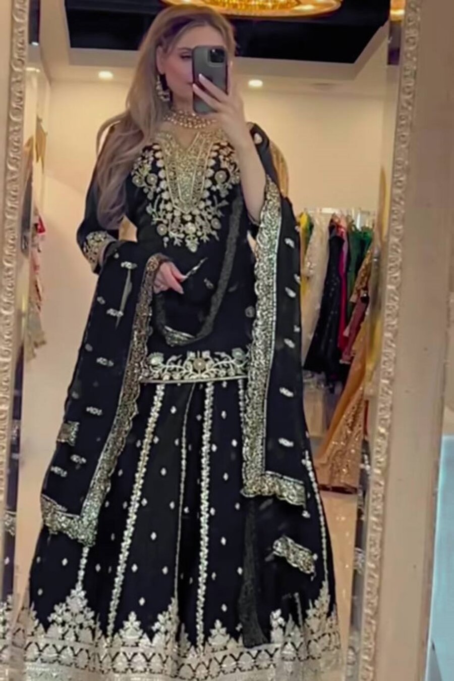 RICH LOOK CHINON SILK EMBROIDERY WITH SEQUENCE WORK TOP LEHENGA WITH DUPATTA BLACK