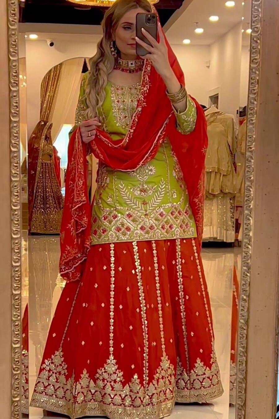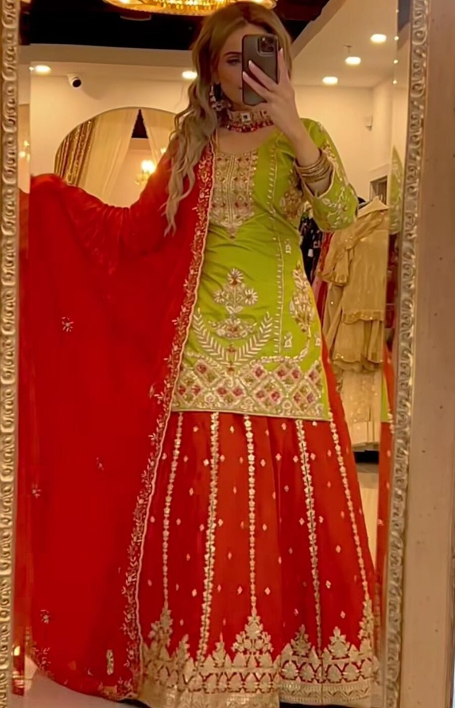 RICH LOOK CHINON SILK SEQUENCE EMBROIDERY WORK TOP PALAZZO WITH DUPATTA ORANGE