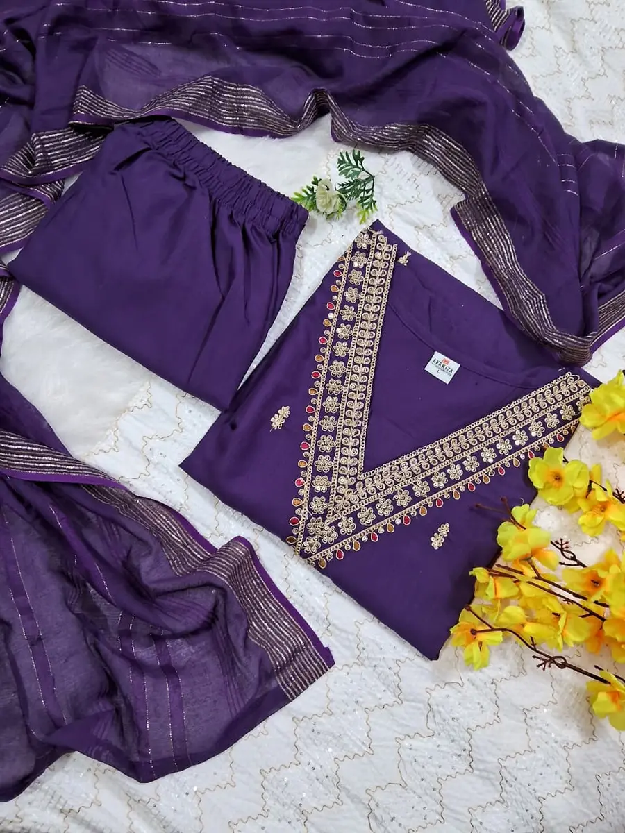 RICH LOOK COTTON EMBROIDERY SEQUENCE WORK TOP BOTTOM WITH DUPATTA PURPLE