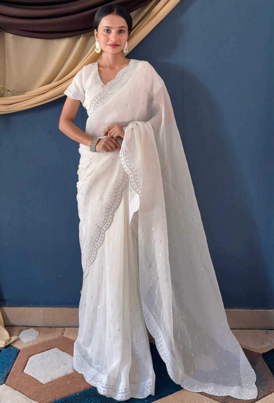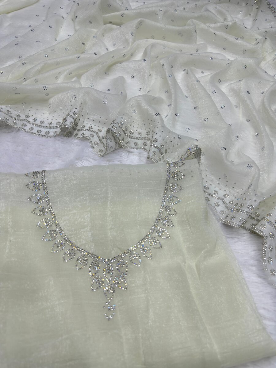 RICH LOOK CRUNCHY SILK ZARJHAN DIAMOND WORK SAREE WITH UNSTITCHED BLOUSE WHITE