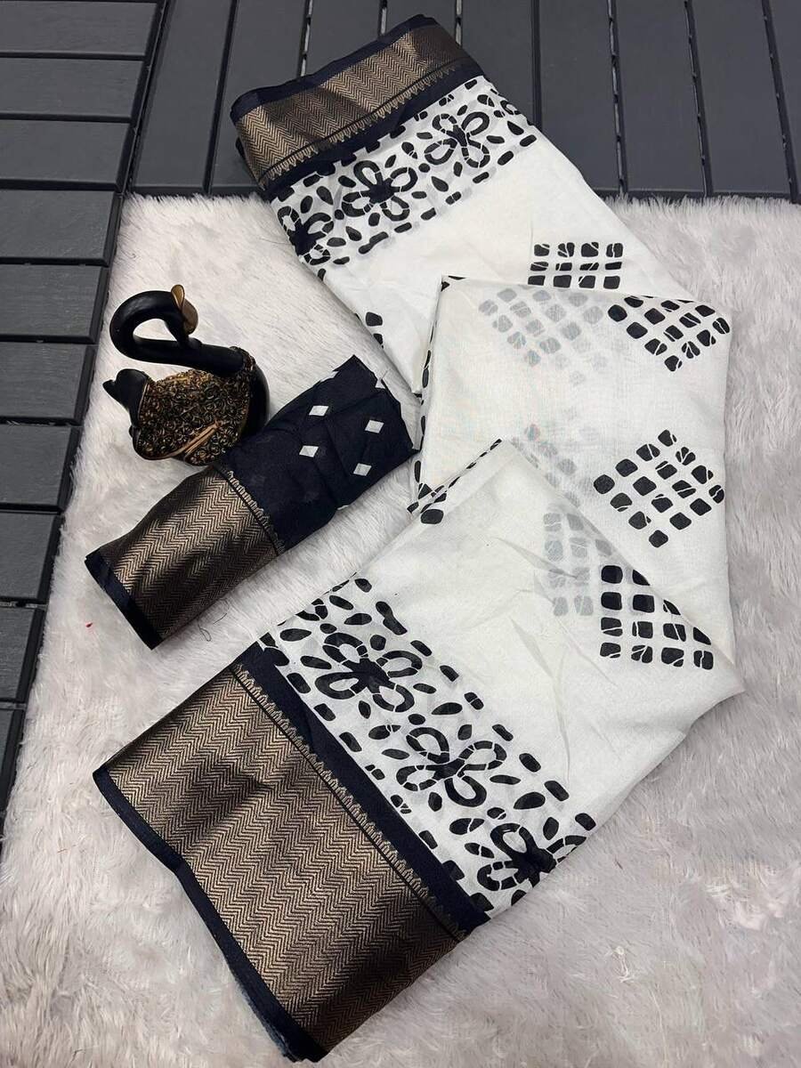 RICH LOOK DOLA SILK JACQUARD WEAVING BORDER AND BATIK PRINT WORK SAREE WITH UNSTITCHED BLOUSE BLACK