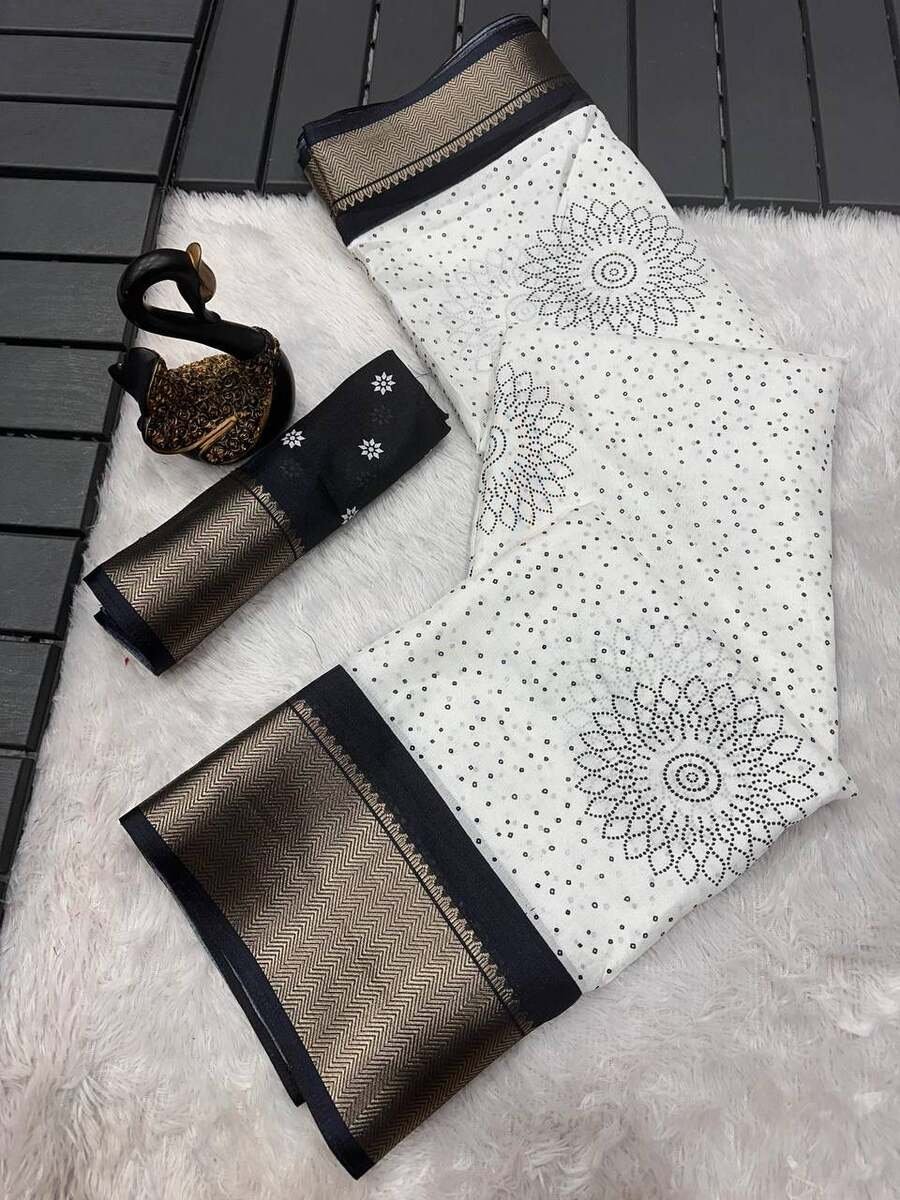 RICH LOOK DOLA SILK JACQUARD WEAVING BORDER AND BATIK PRINT WORK SAREE WITH UNSTITCHED BLOUSE BLACK