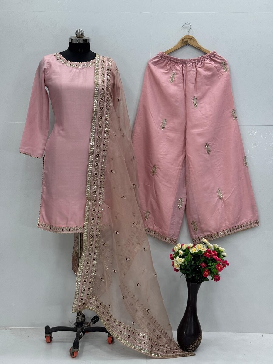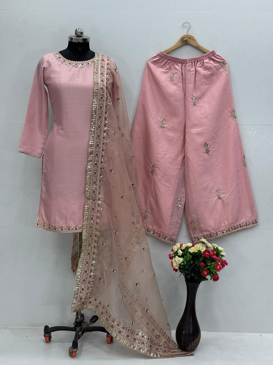 RICH LOOK DULL SATIN EMBROIDERY SEQUENCE WORK TOP PALAZZO WITH DUPATTA BABY PINK