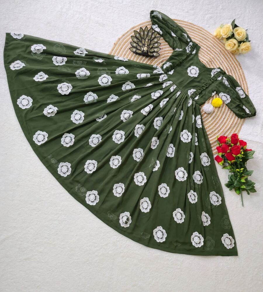 RICH LOOK FAUX GEORGETTE THREAD WORK ONE PIECE DRESS GREEN