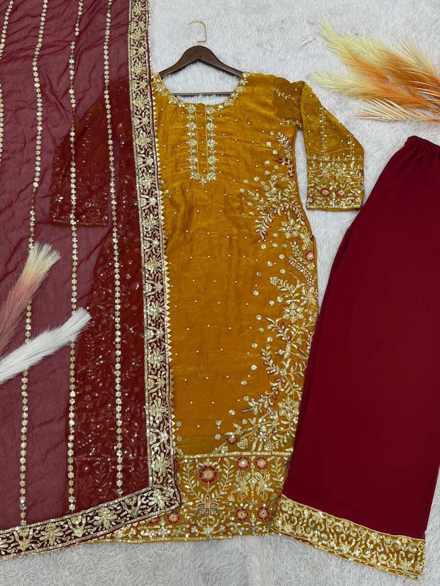 RICH LOOK FENDI SILK EMBROIDERY AND SEQUENCE WORK WITH RIVET MOTI WORK TOP PALAZZO WITH DUPATTA YELLOW