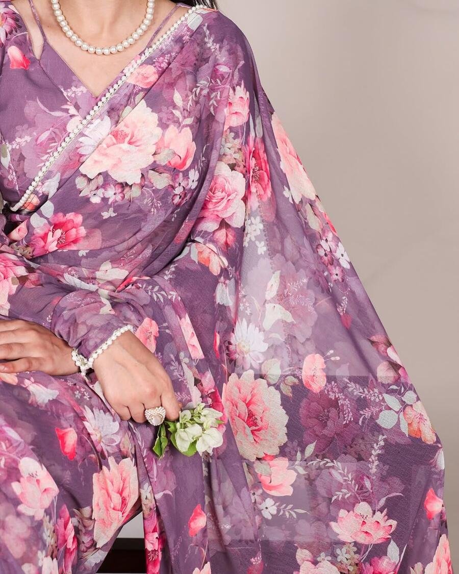 RICH LOOK GEORGETTE DIGITAL PRINT AND PEARL LACE BORDER WORK SAREE WITH UNSTITCHED BLOUSE WINE