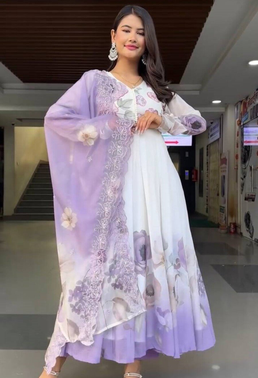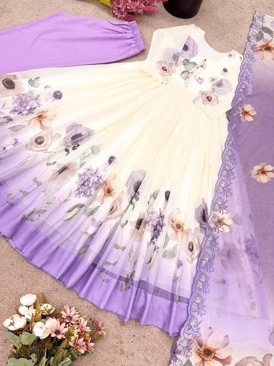 RICH LOOK GEORGETTE EMBROIDERY AND FLORAL PRINTED WORK GOWN BOTTOM WITH DUPATTA LAVENDER