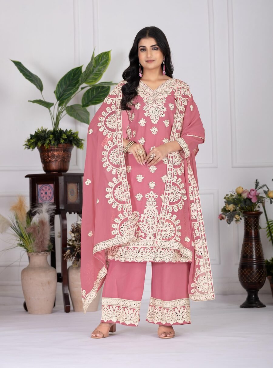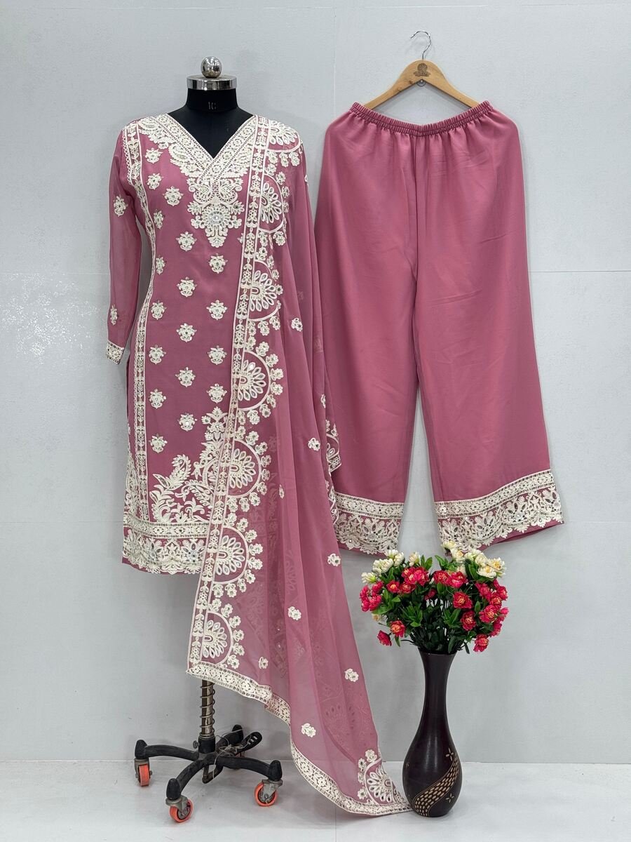 RICH LOOK GEORGETTE EMBROIDERY SEQUENCE WORK WITH REAL MIRROR HAND WORK TOP PALAZZO WITH DUPATTA BABY PINK