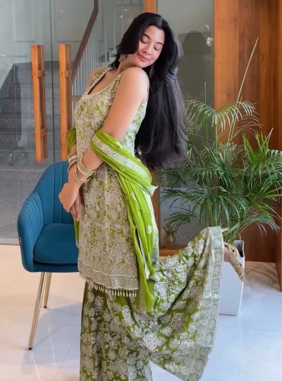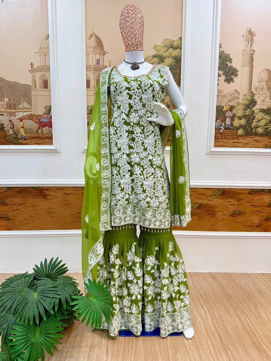 RICH LOOK GEORGETTE EMBROIDERY WORK TOP SHARARA WITH DUPATTA GREEN