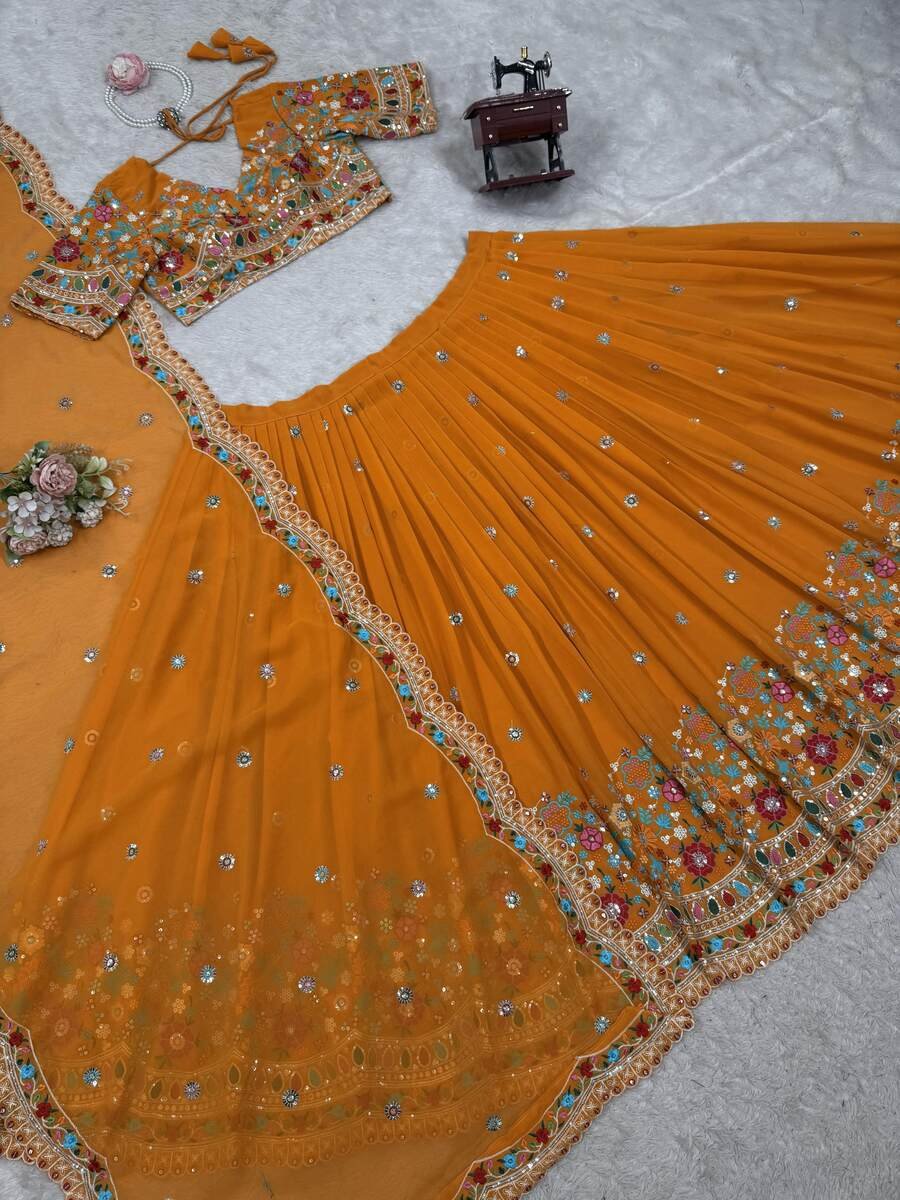 RICH LOOK GEORGETTE THREAD WITH SEQUENCE WORK LEHENGA CHOLI WITH DUPATTA MUSTARD