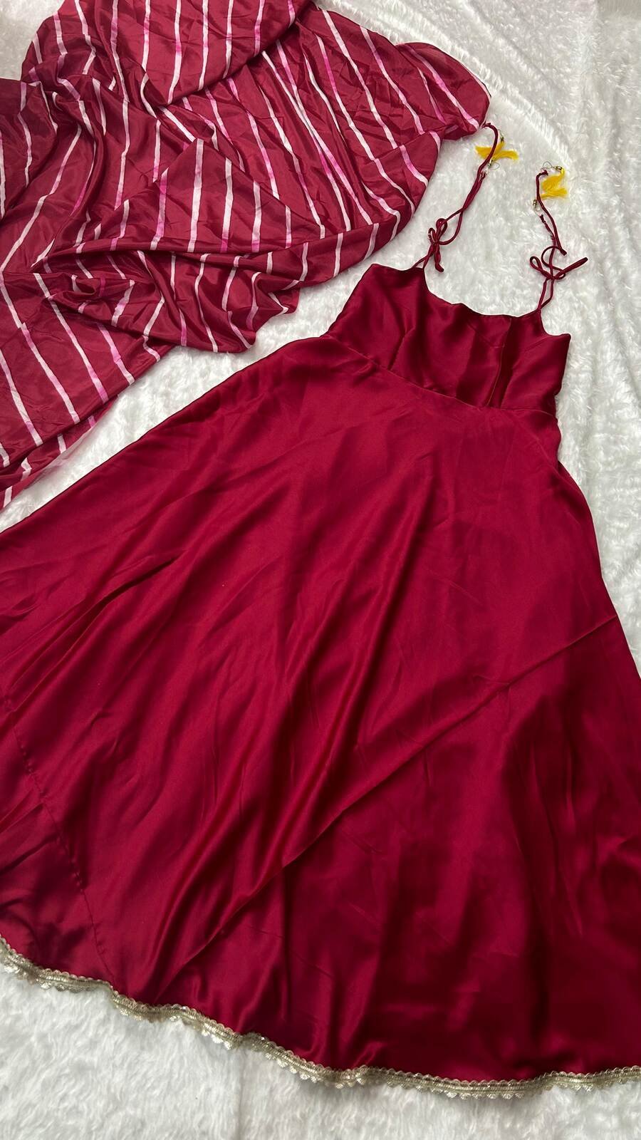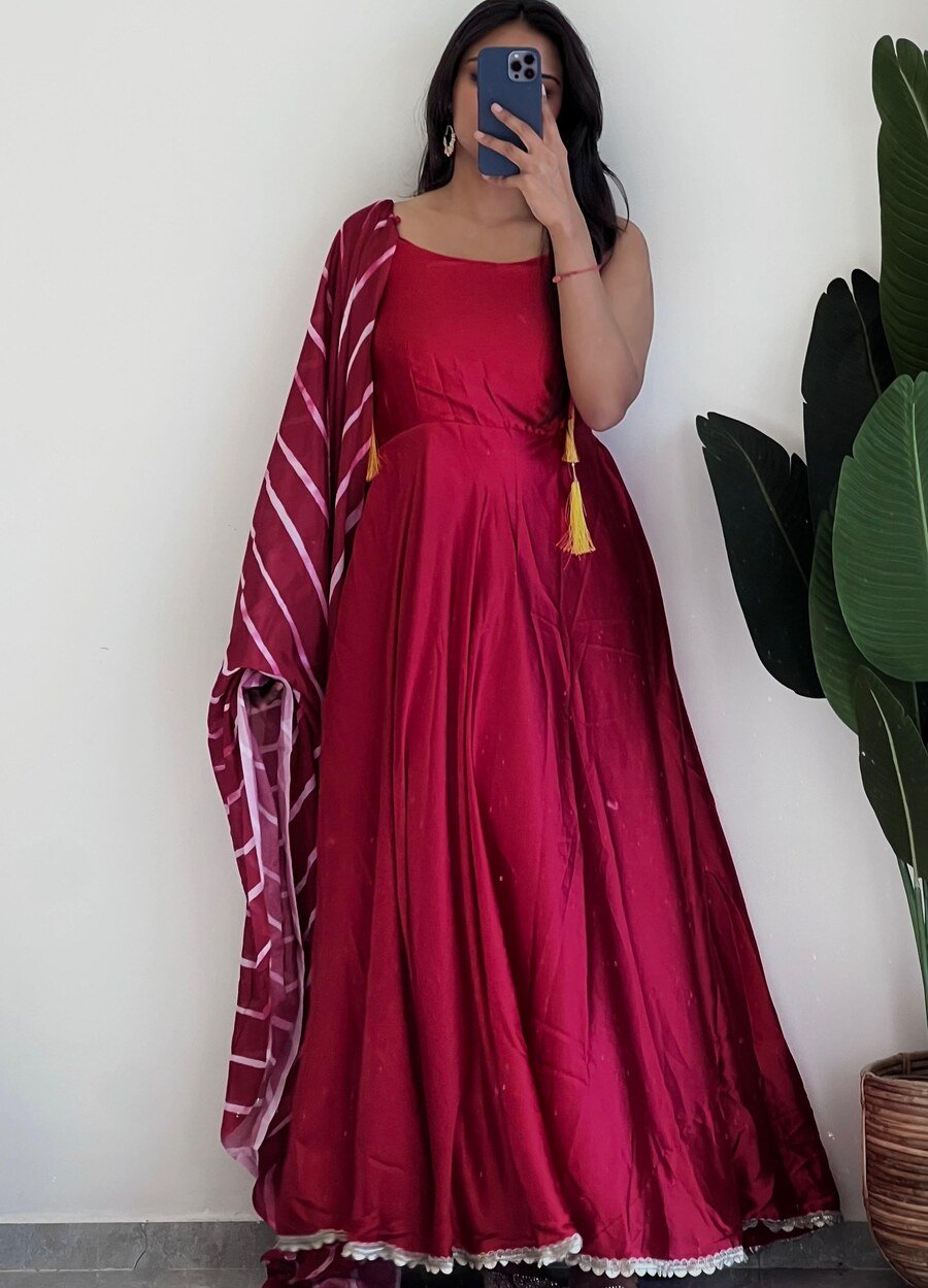 RICH LOOK JAPAN SILK FANCY LACE BORDER WORK ANARKALI GOWN WITH DUPATTA MAROON