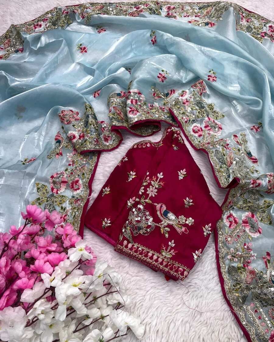RICH LOOK JIMMY CHOO SEQUENCE THREAD EMBROIDERY CODING WORK SAREE WITH UNSTITCHED BLOUSE SKY