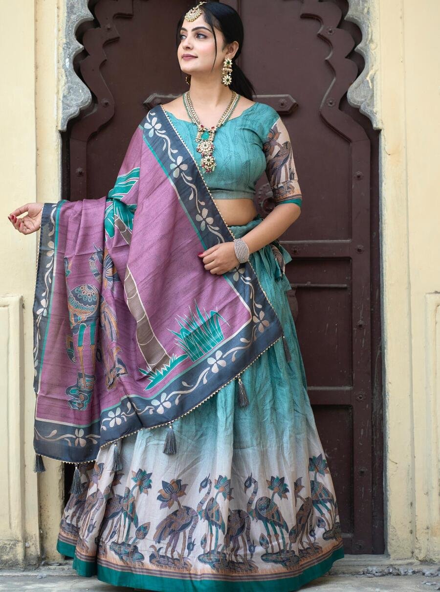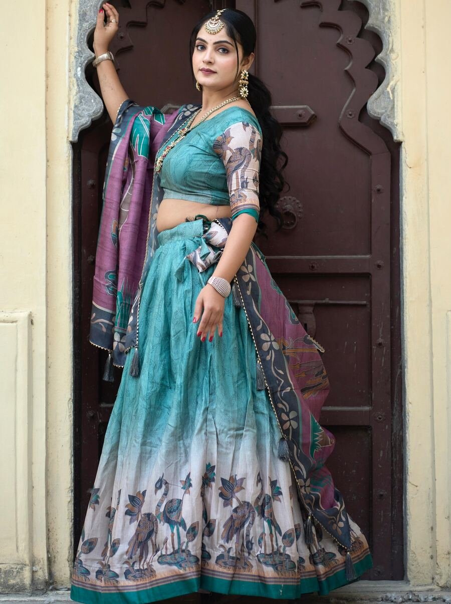 RICH LOOK MANIPURI SILK PRINTED WITH CONTRAST BORDER WORK LEHENGA CHOLI WITH DUPATTA RAMA
