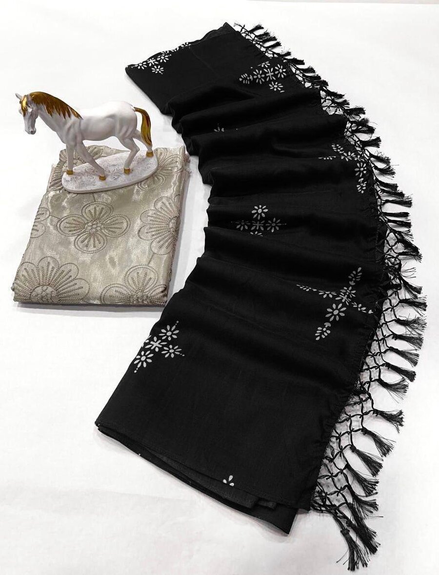 RICH LOOK MUSLIN COTTON SILK DIGITAL PRINT WORK SAREE WITH UNSTITCHED BLOUSE BLACK