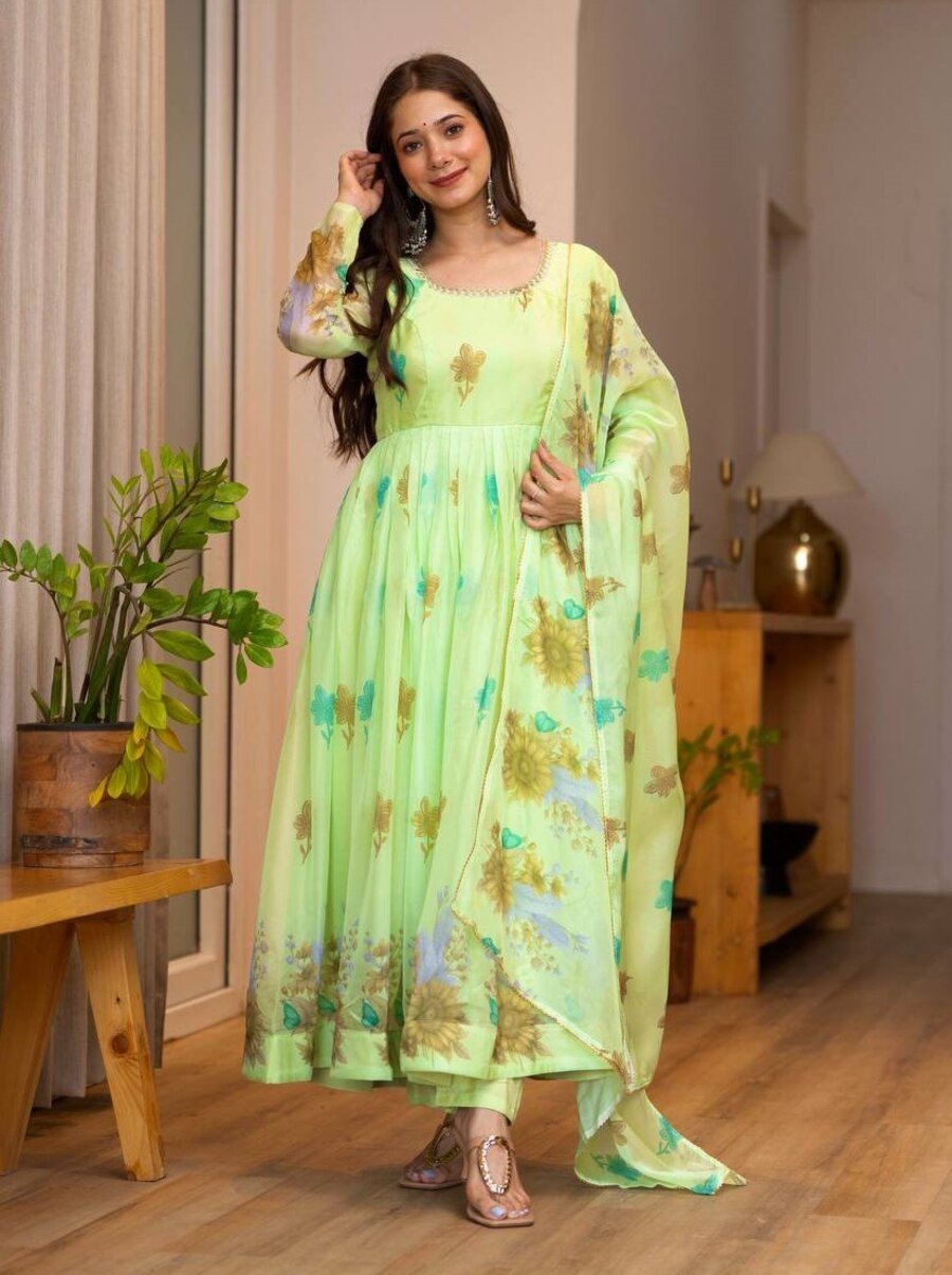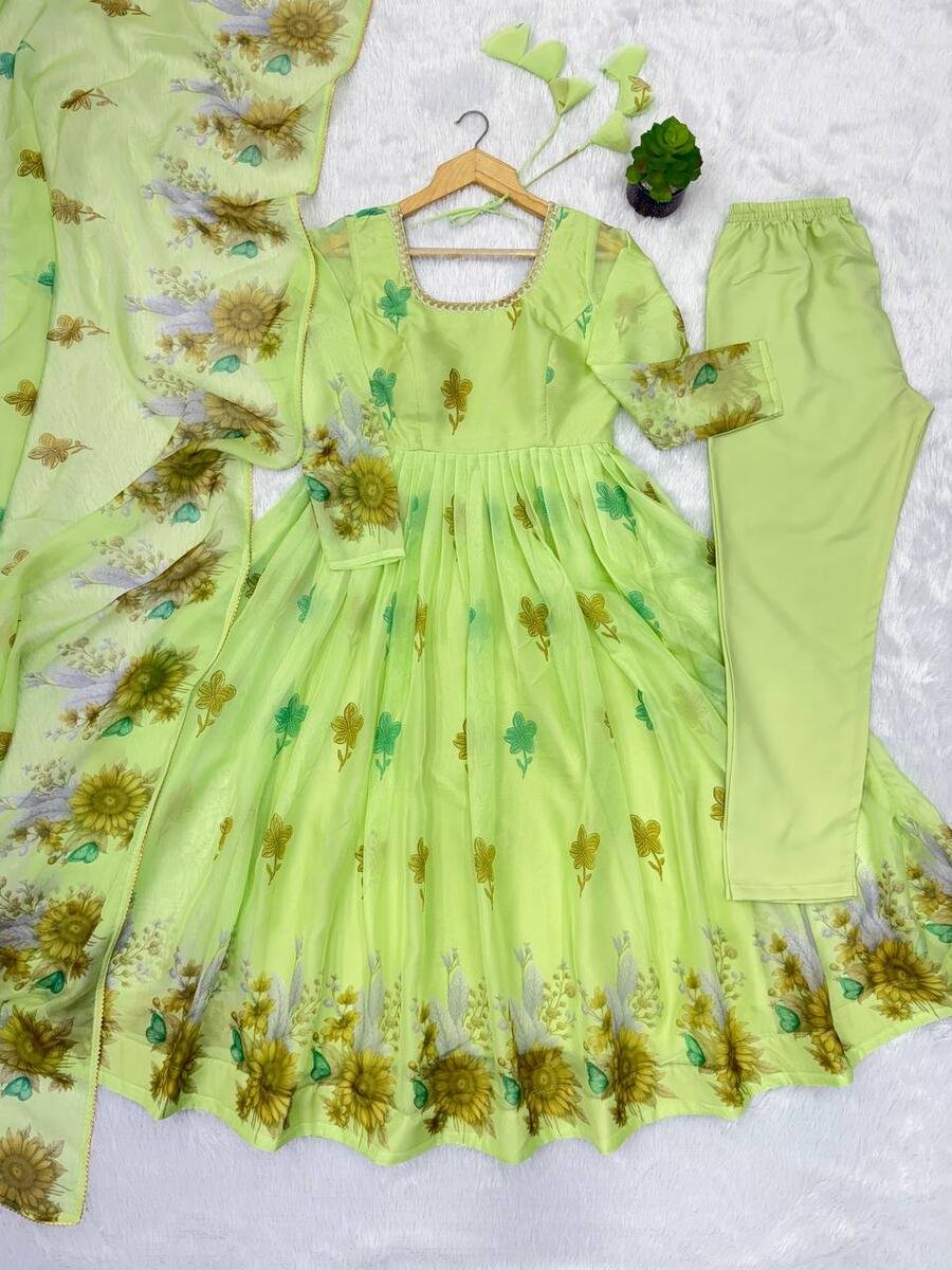 RICH LOOK ORGANZA FLORAL PRINT WORK ANARKALI GOWN BOTTOM WITH DUPATTA PARROT GREEN