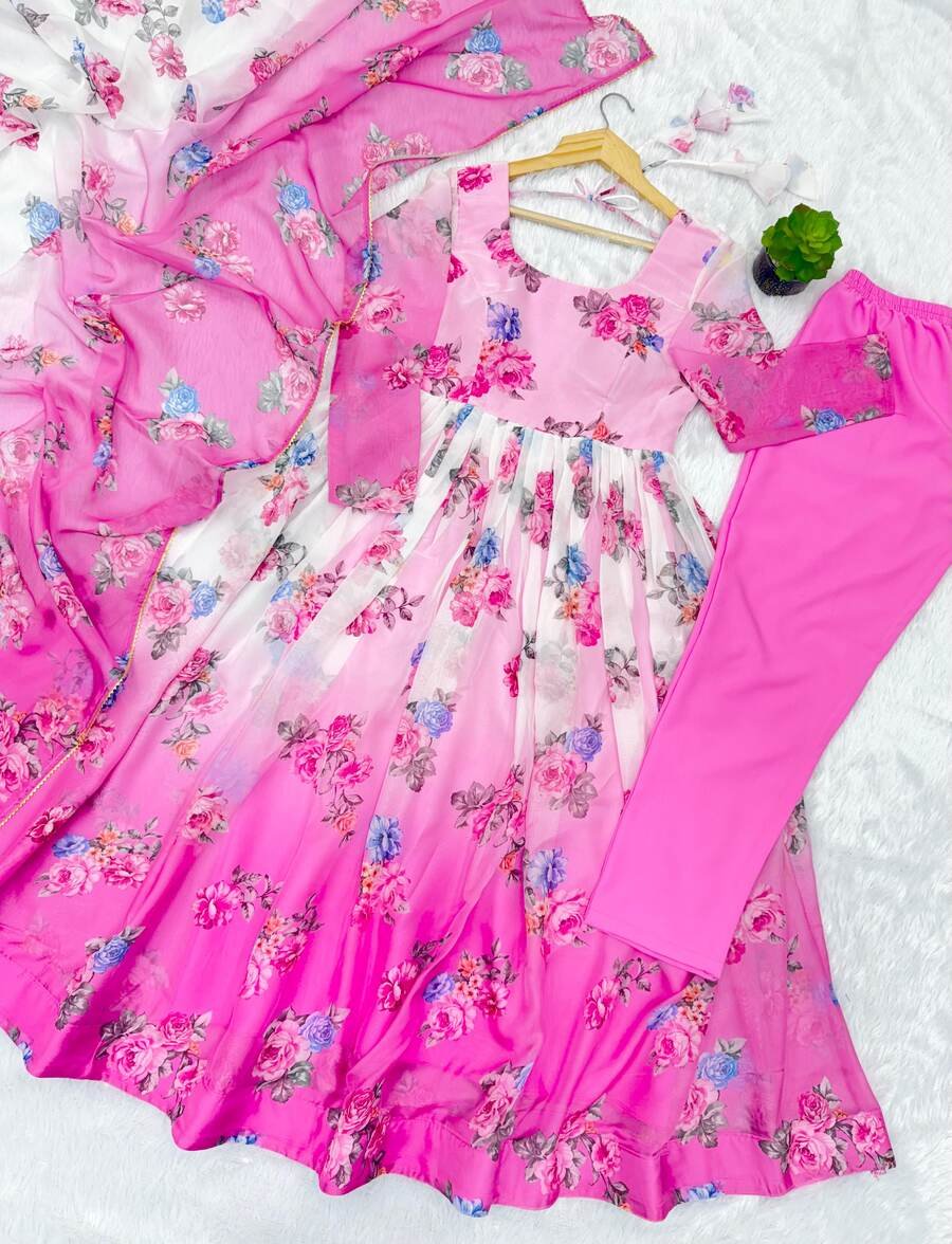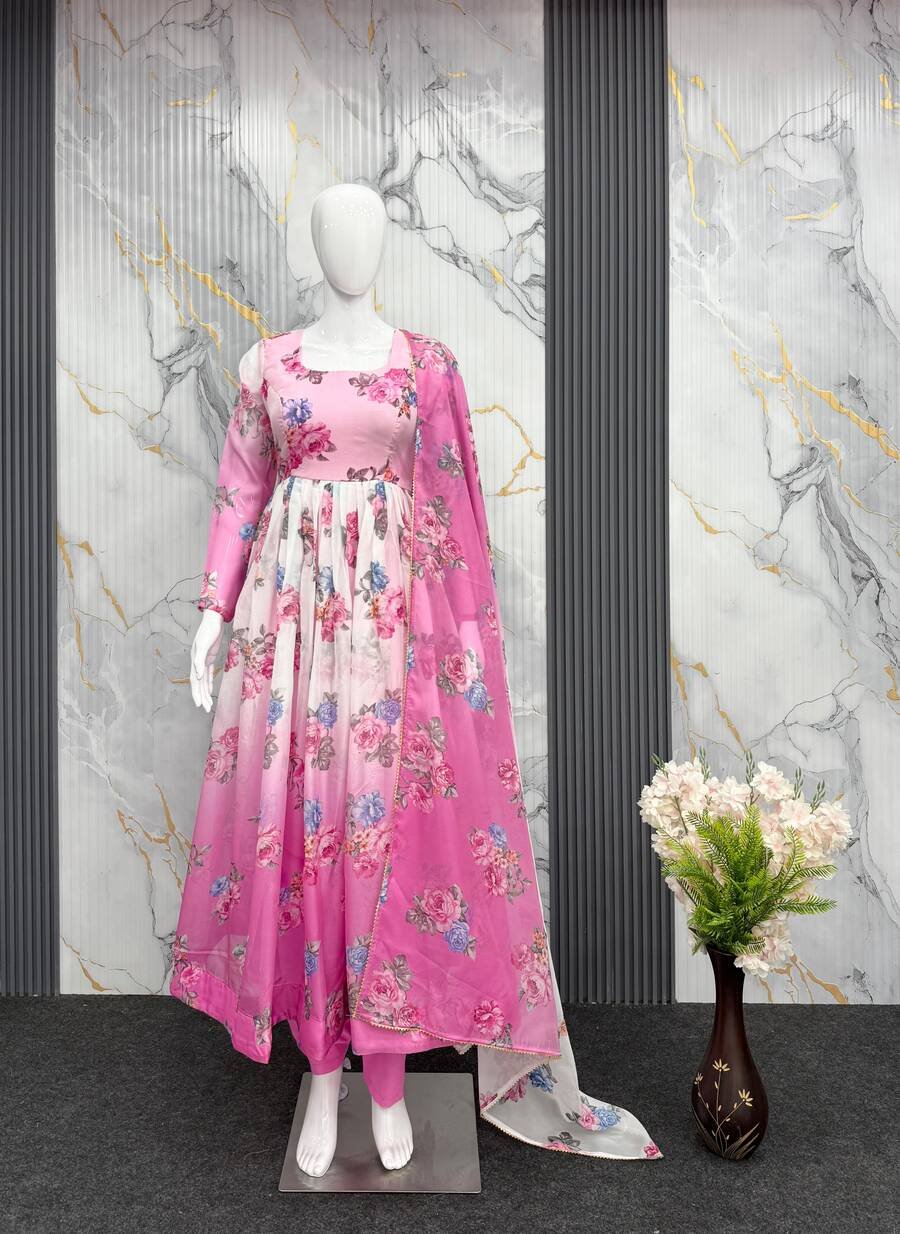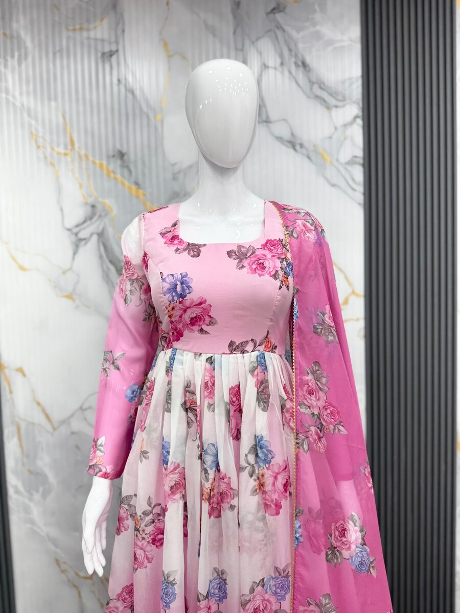 RICH LOOK ORGANZA FLORAL PRINT WORK ANARKALI GOWN BOTTOM WITH DUPATTA PINK