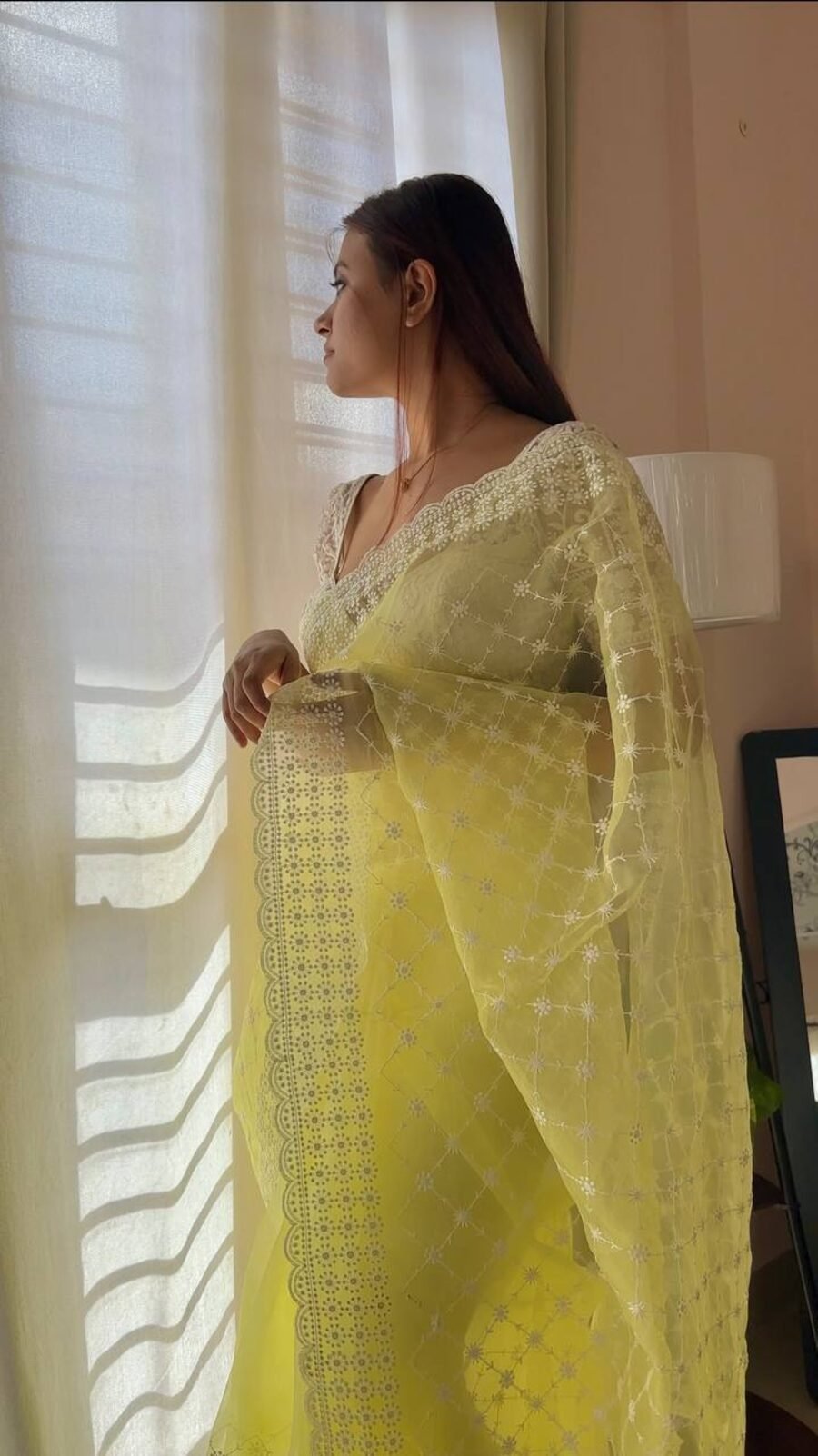 RICH LOOK ORGANZA SILK EMBROIDERY THRAED CUT WORK SAREE WITH STITCHED BLOUSE LEMON