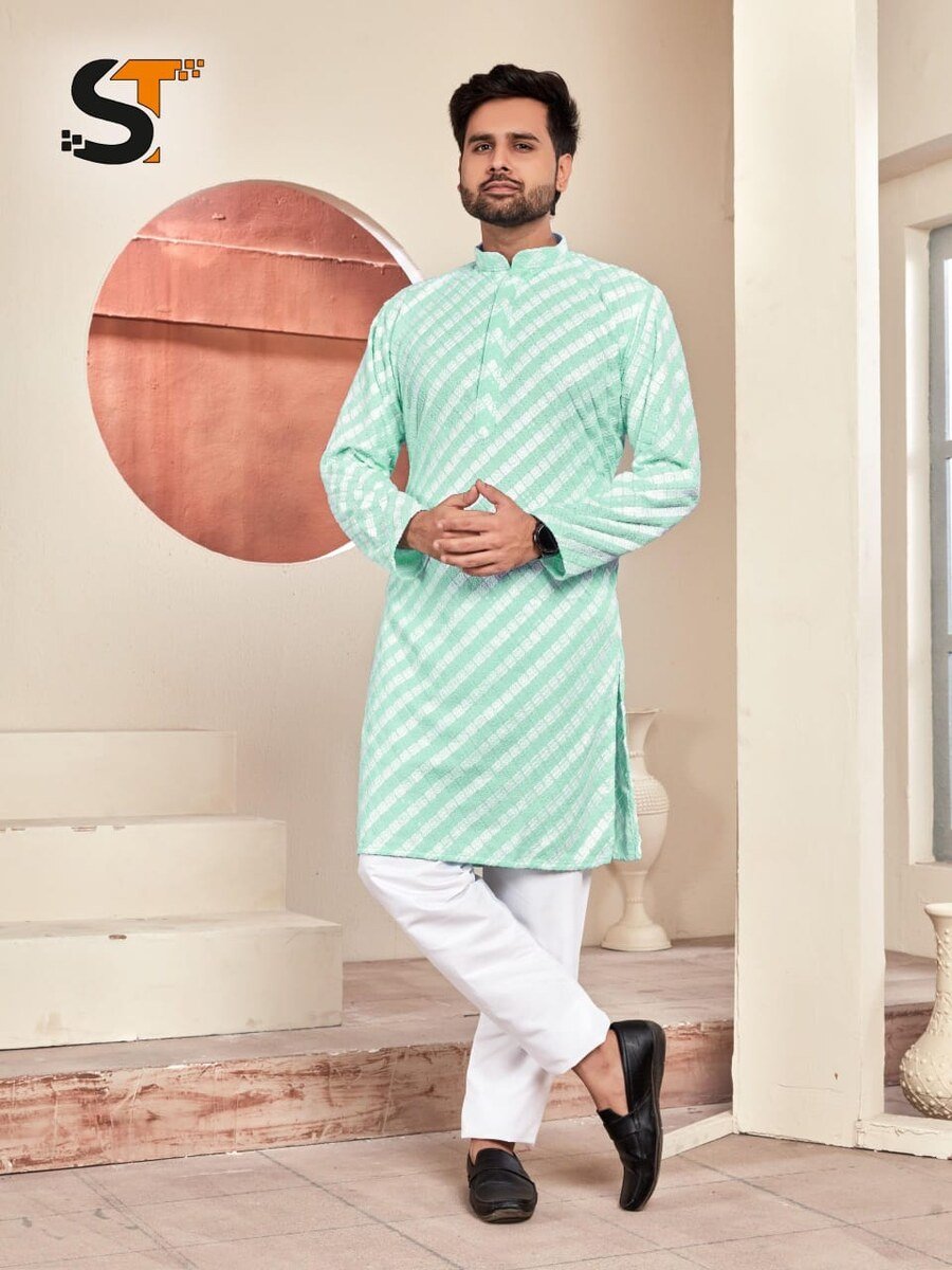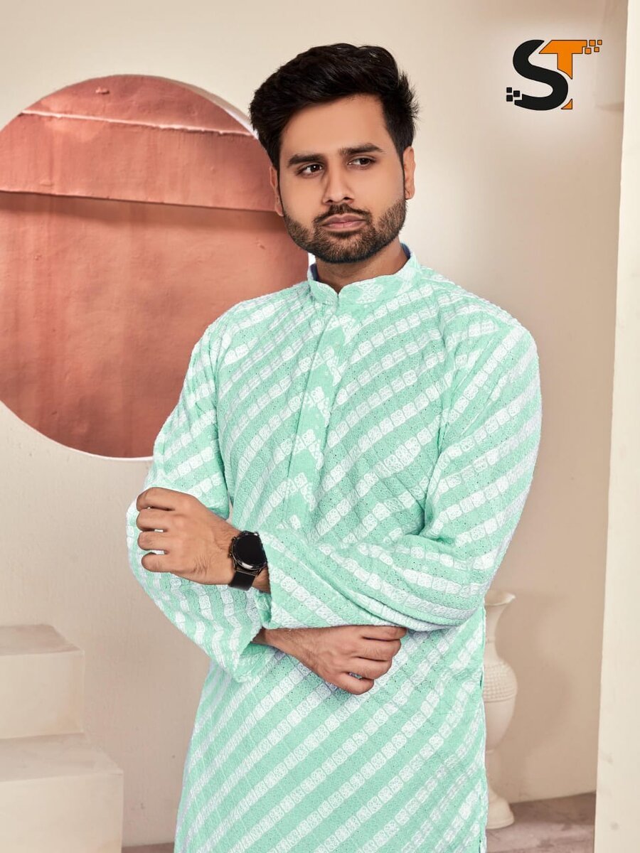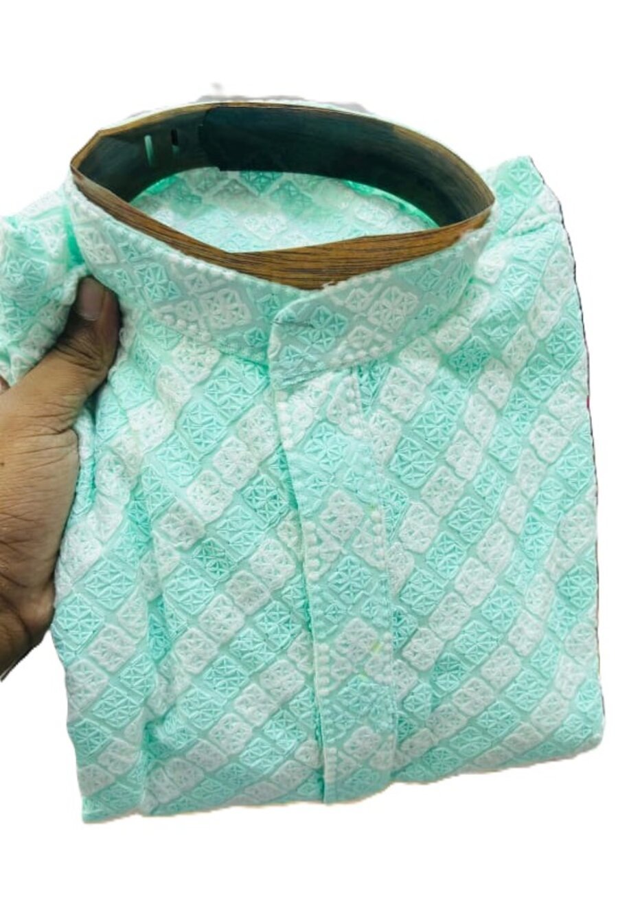 RICH LOOK RAYON CHIKAN DUBLE THREAD WORK MEN’S KURTA PAYJAMA SET RAMA