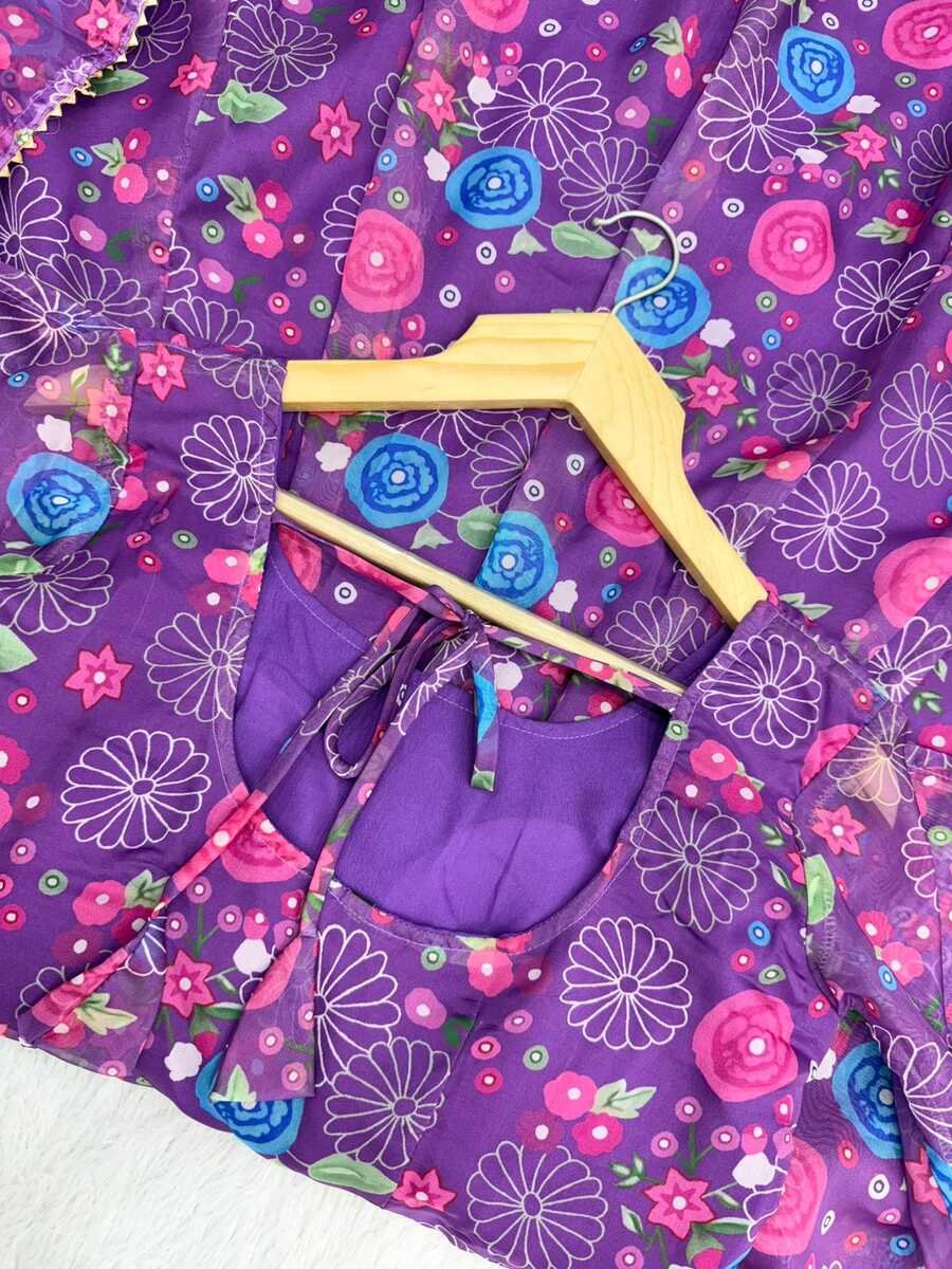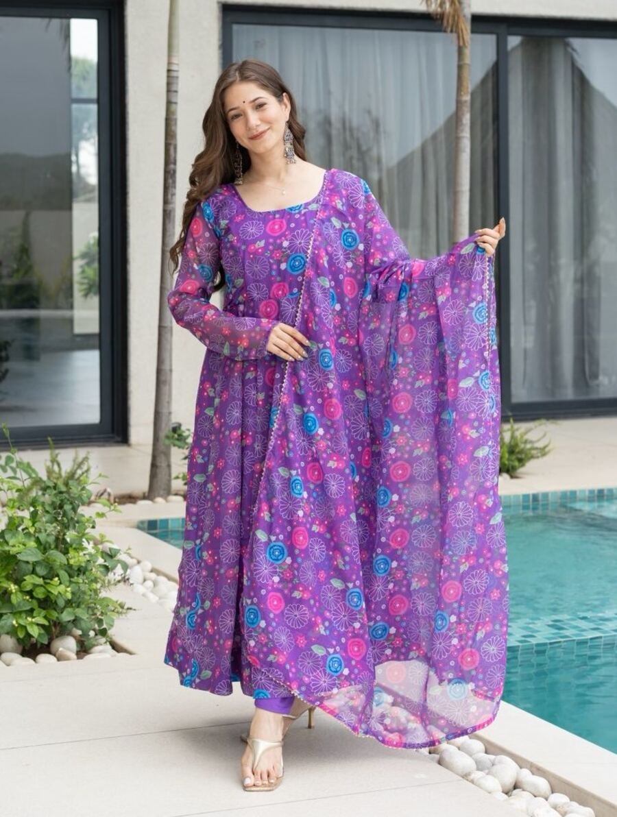 RICH LOOK SOFT ORGANZA FLORAL PRINTED ANARKALI GOWN BOTTOM WITH DUPATTA PURPLE