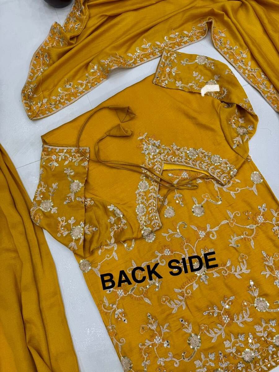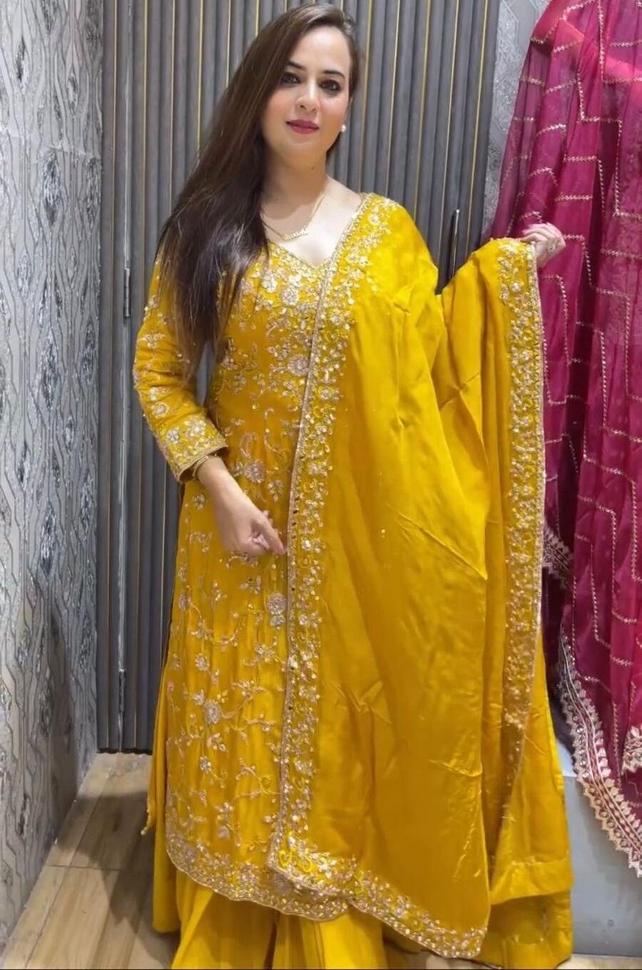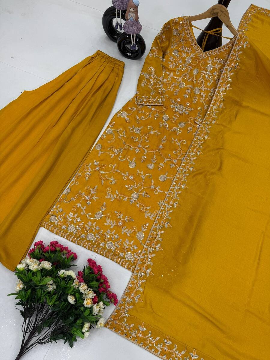RICH LOOK VICHITRA SILK EMBROIDERY SEQUENCE WORK WITH REAL MIRROR TOP PALAZZO WITH DUPATTA YELLOW