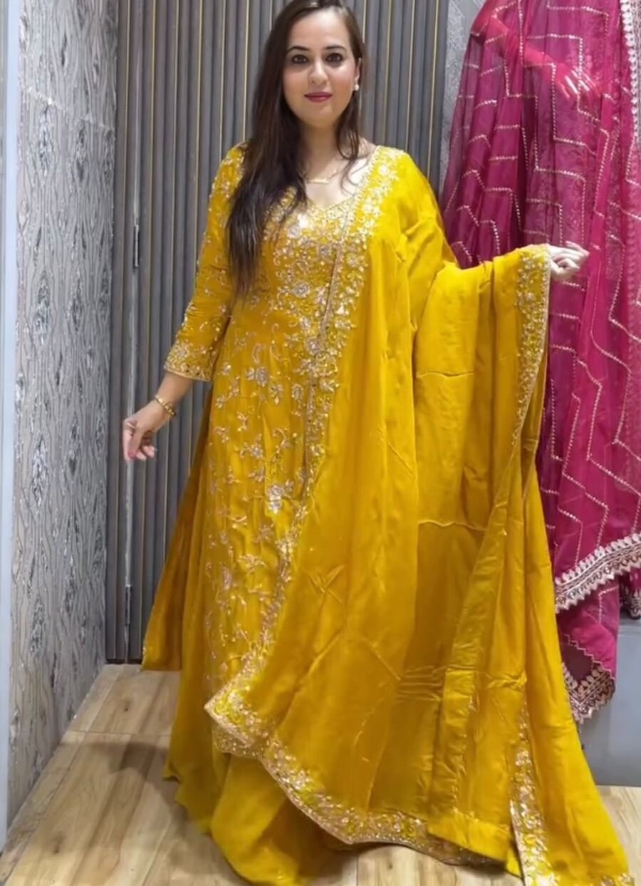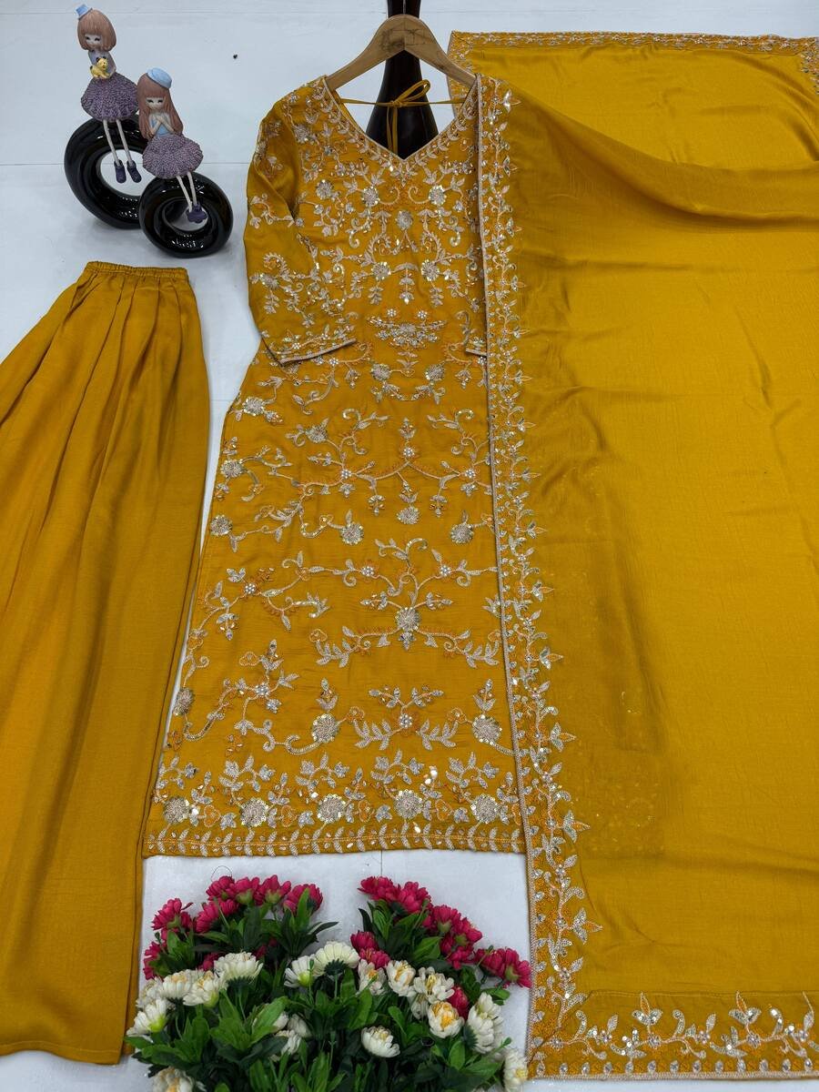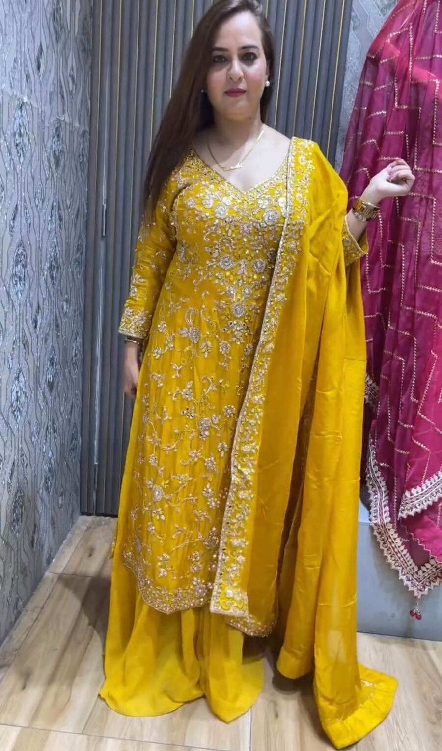 RICH LOOK VICHITRA SILK EMBROIDERY SEQUENCE WORK WITH REAL MIRROR TOP PALAZZO WITH DUPATTA YELLOW