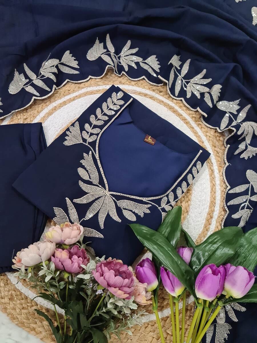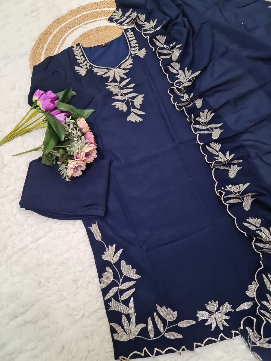 RICH LOOK VICHITRA SILK SEQUENCE EMBROIDERY WORK TOP BOTTOM WITH DUPATTA NAVY BLUE
