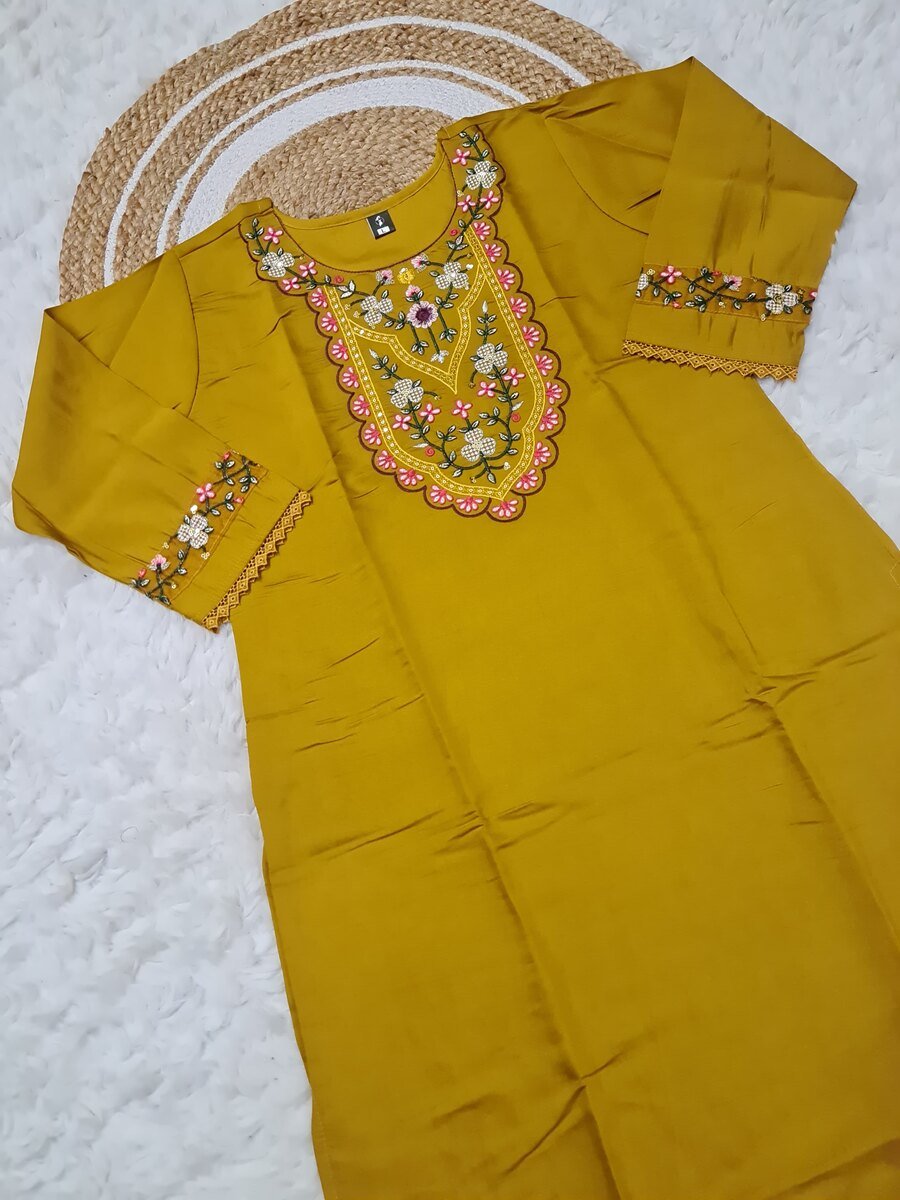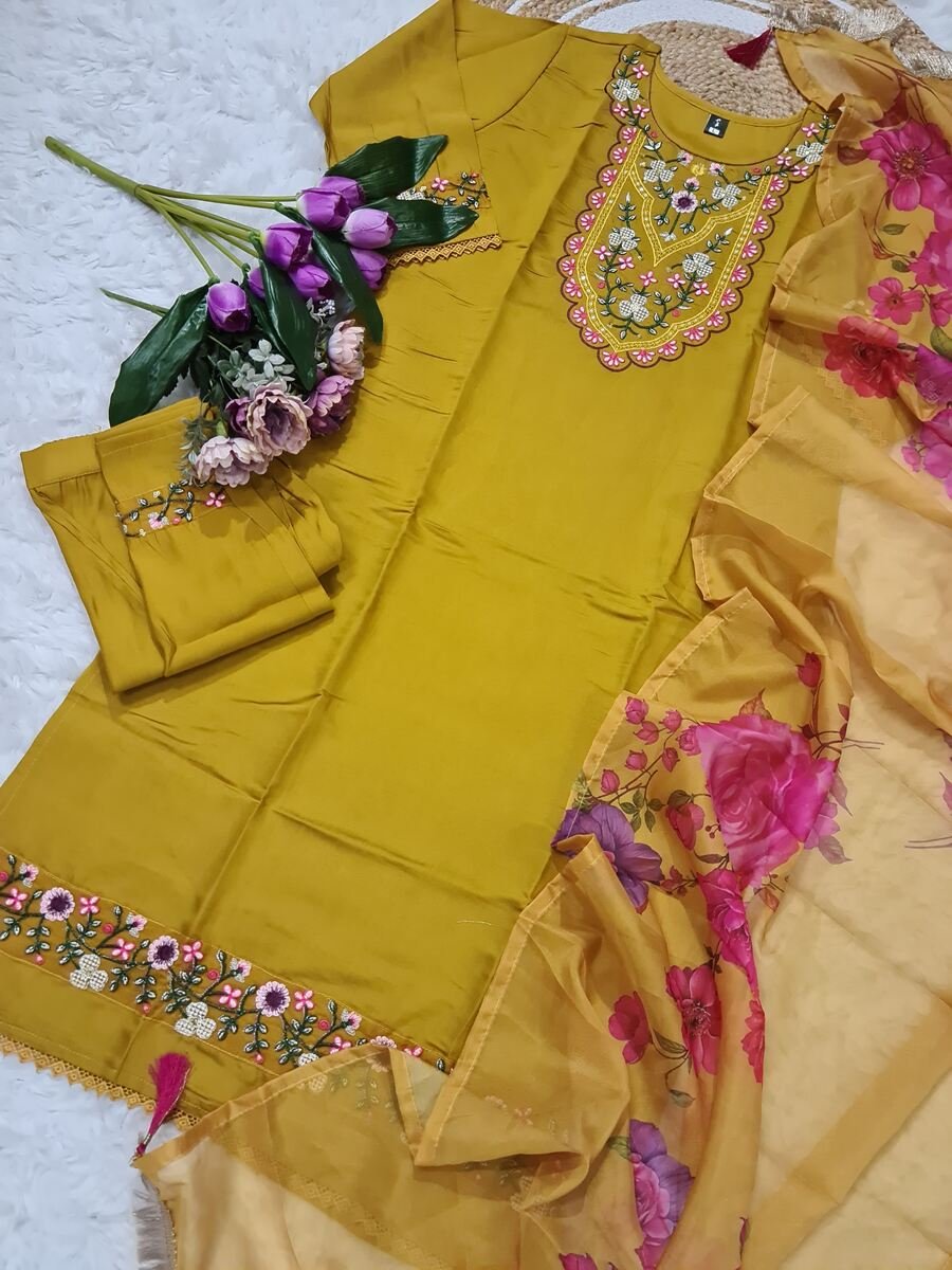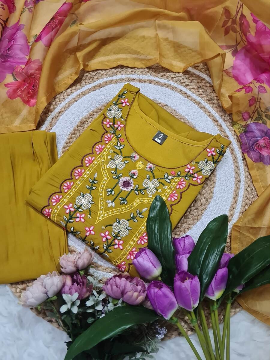 RICH LOOK VISCOSE CHANDERI SEQUENCE EMBROIDERY WORK TOP BOTTOM WITH DUPATTA MUSTARD