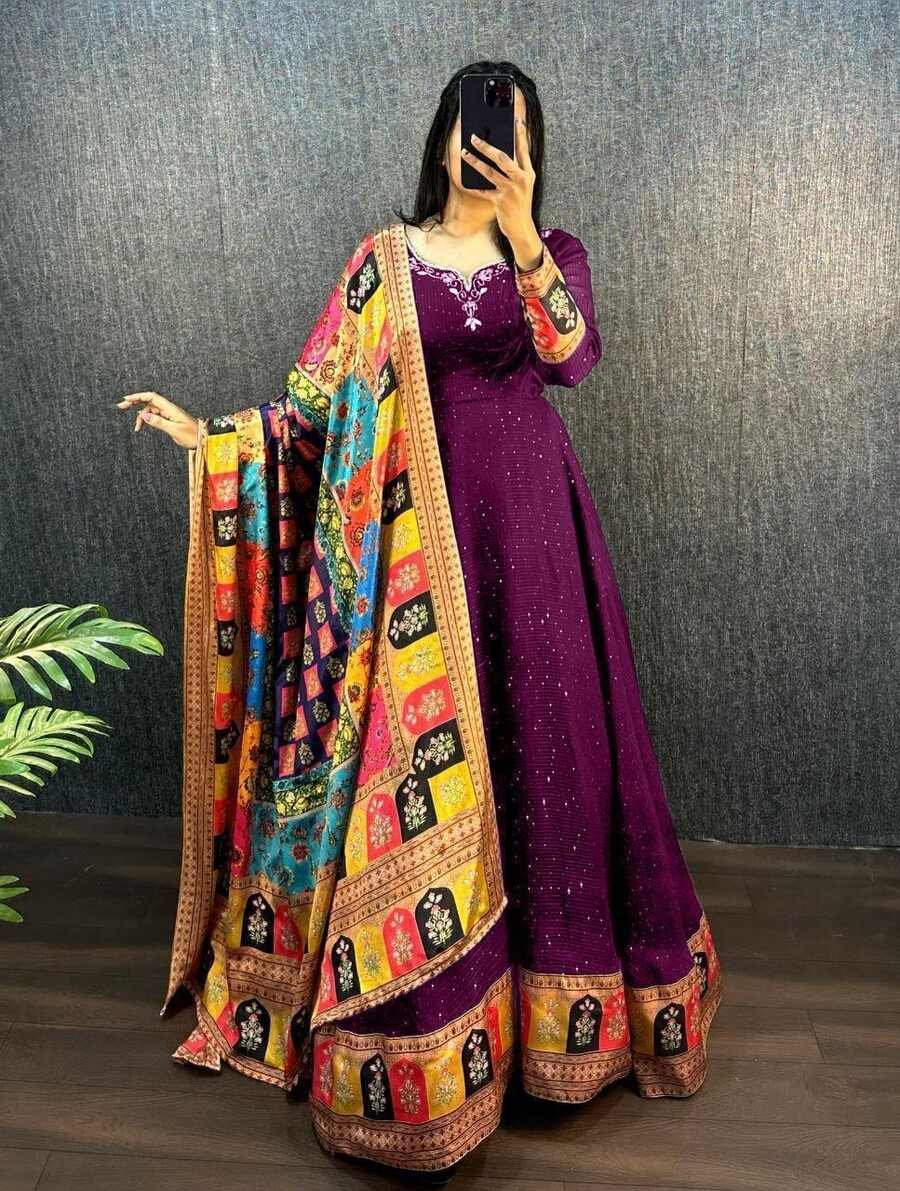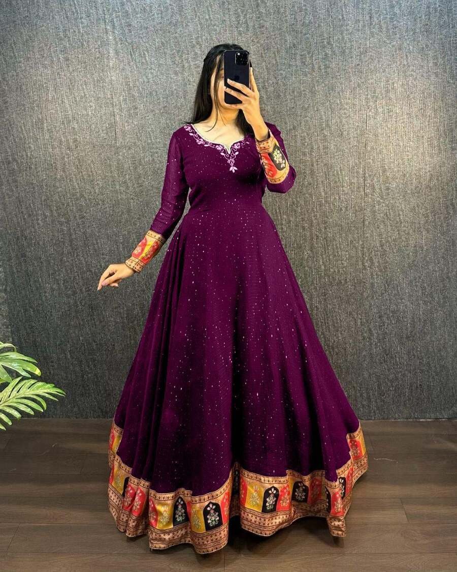 TRADITIONAL VISCOSE GEORGETTE EMBROIDERY HAND WORK WITH TUSSER SILK BORDER GOWN WITH DIGITAL PRINTED DUPATTA WINE
