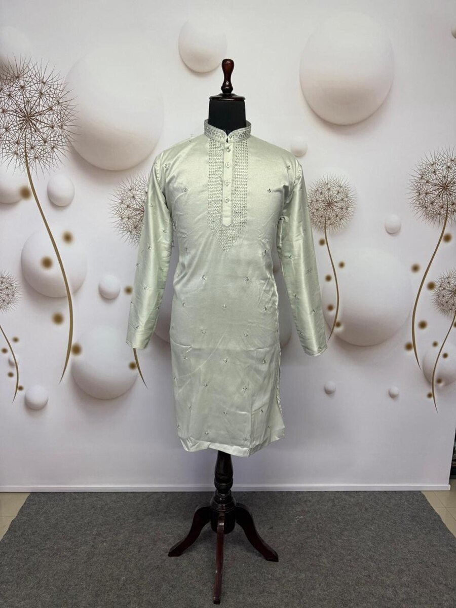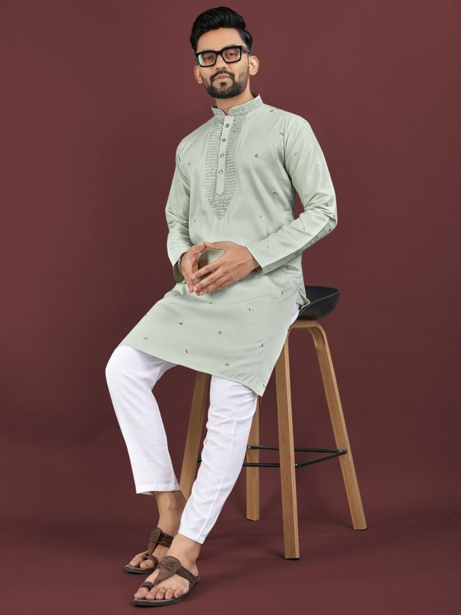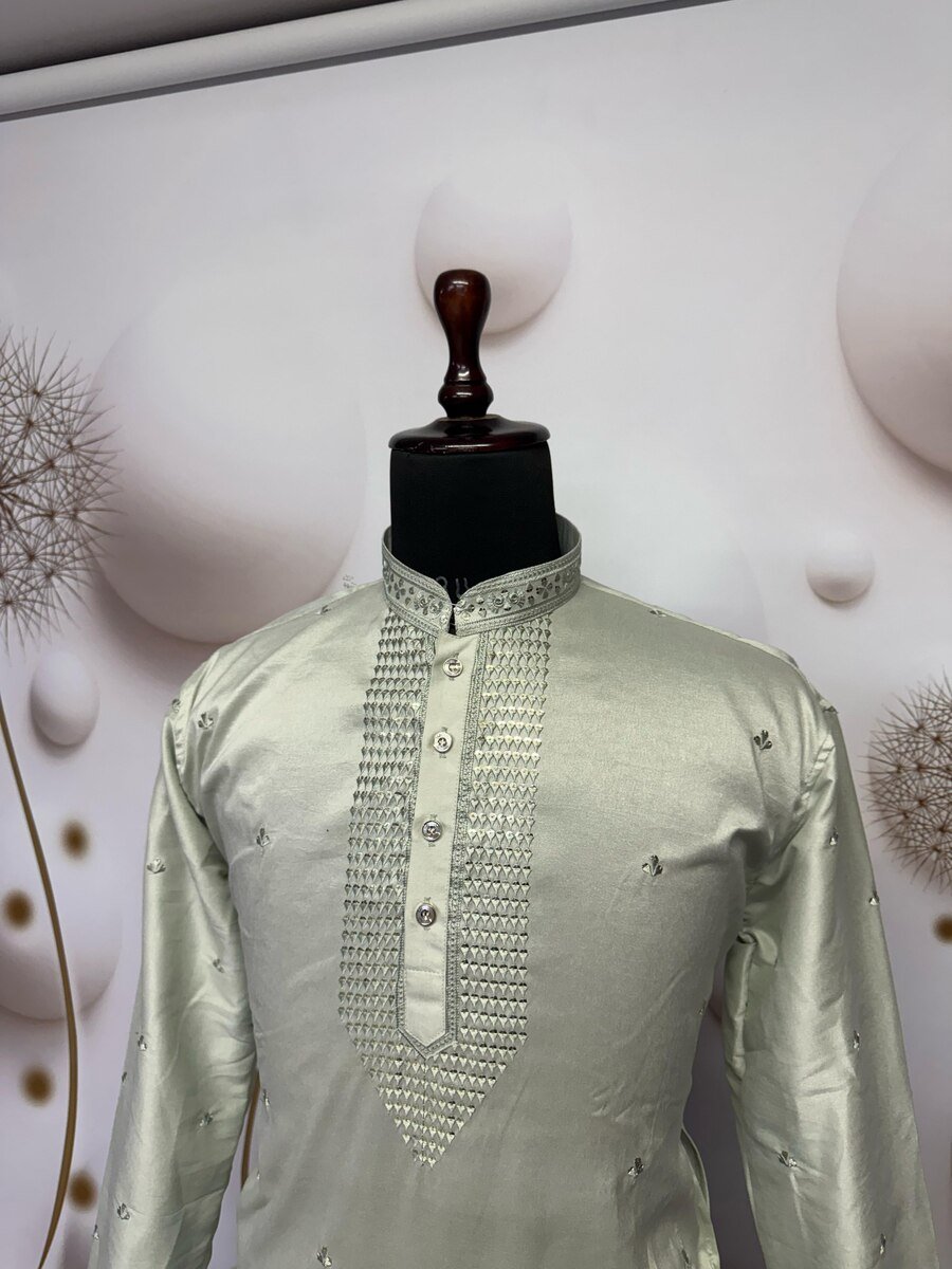 TRADITIONAL VISCOSE SILK EMBROIDERY SEQUENCE WORK MEN’S KURTA WITH PAYJAMA MINT